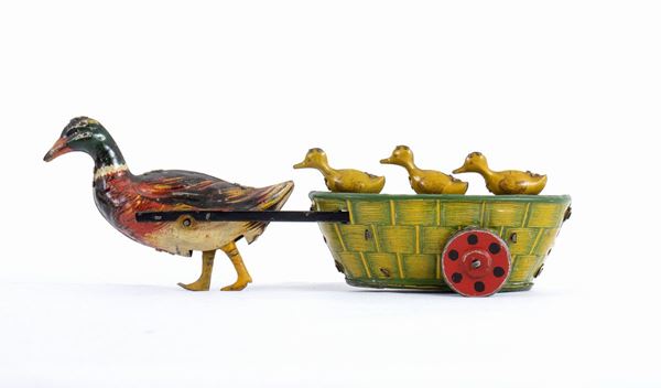 Mother duck with three ducks in tow basket. Lithographed tin, wind up mechanism. Marked QUACK-QUACK PAAK-PAAK - LEHMANN EPL 645 Made in Germany. 1900s