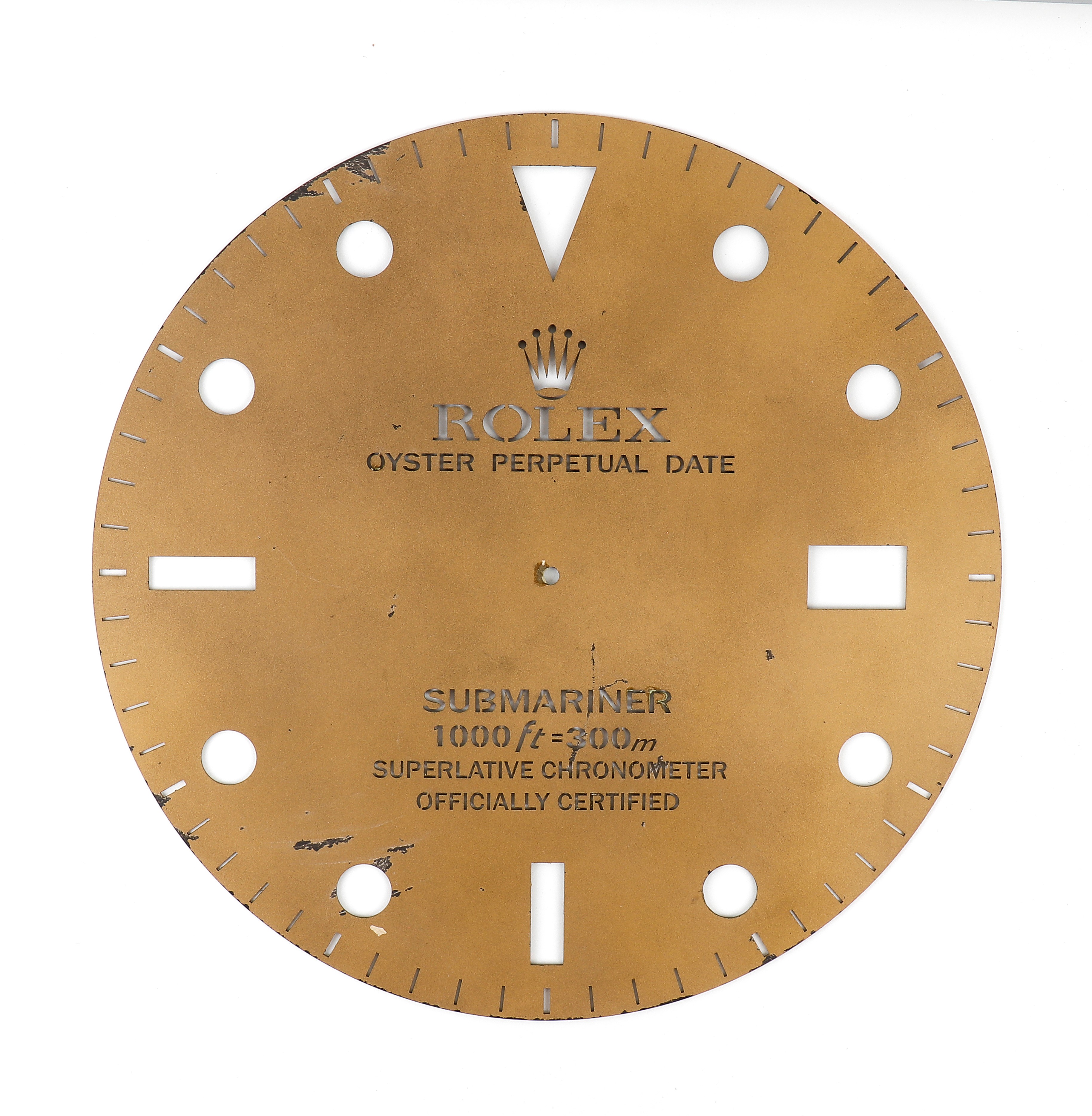 Advertising, dial for ROLEX SUBMARINER - Oyster Perpetual Date - Superlative Chronometer Officially Certified. Matte gold-plated metal disc with perforated indications, perforated minute and hour markers. Central hole for the hand pin. In good condition. Measures approximately 40 cm in diameter