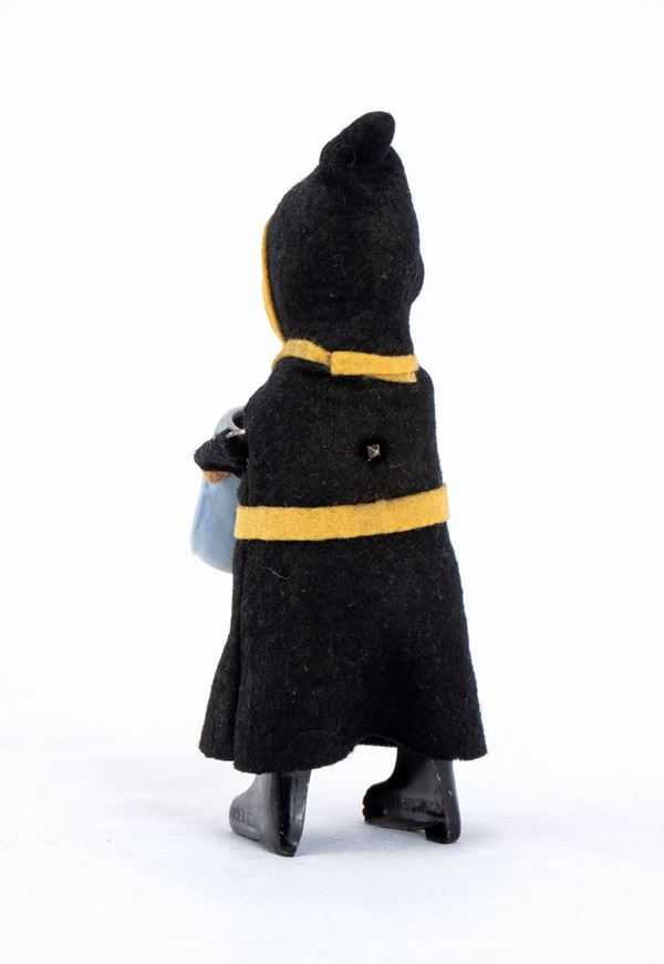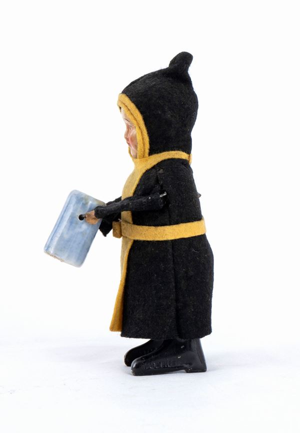 Character from SCHUCO, Germany, drinking friar with black and yellow habit, blue painted ceramic mug, wind up mechanism. 1930s. Marked on the feet