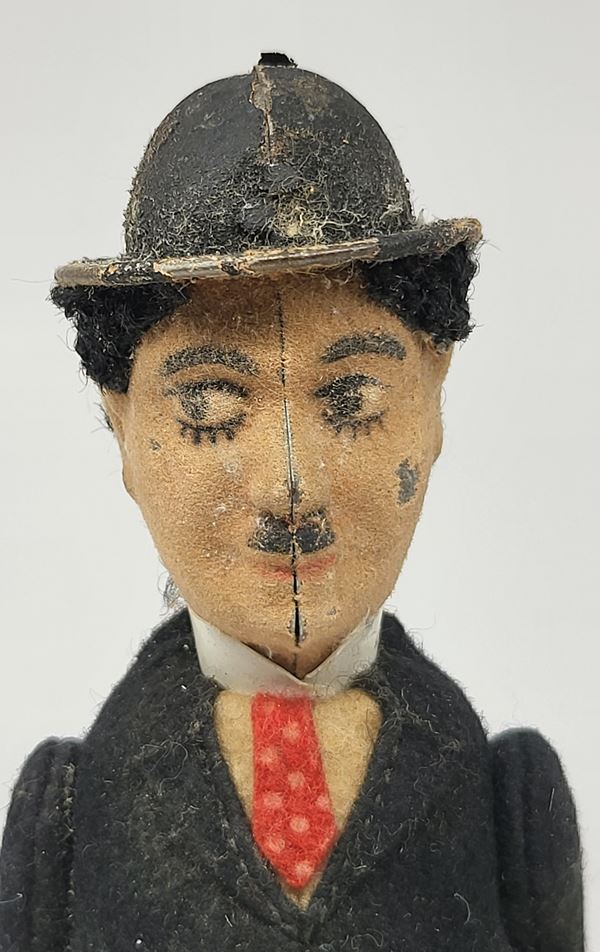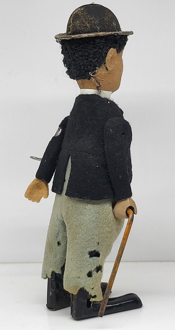 Charlie Chaplin by SCHUCO, Made in Germany, working spring mechanism. Hand-painted face on flock-covered sheet metal, rare version. Measures approximately 17 cm tall. Working, good condition, some defects in the fabric of the dress.