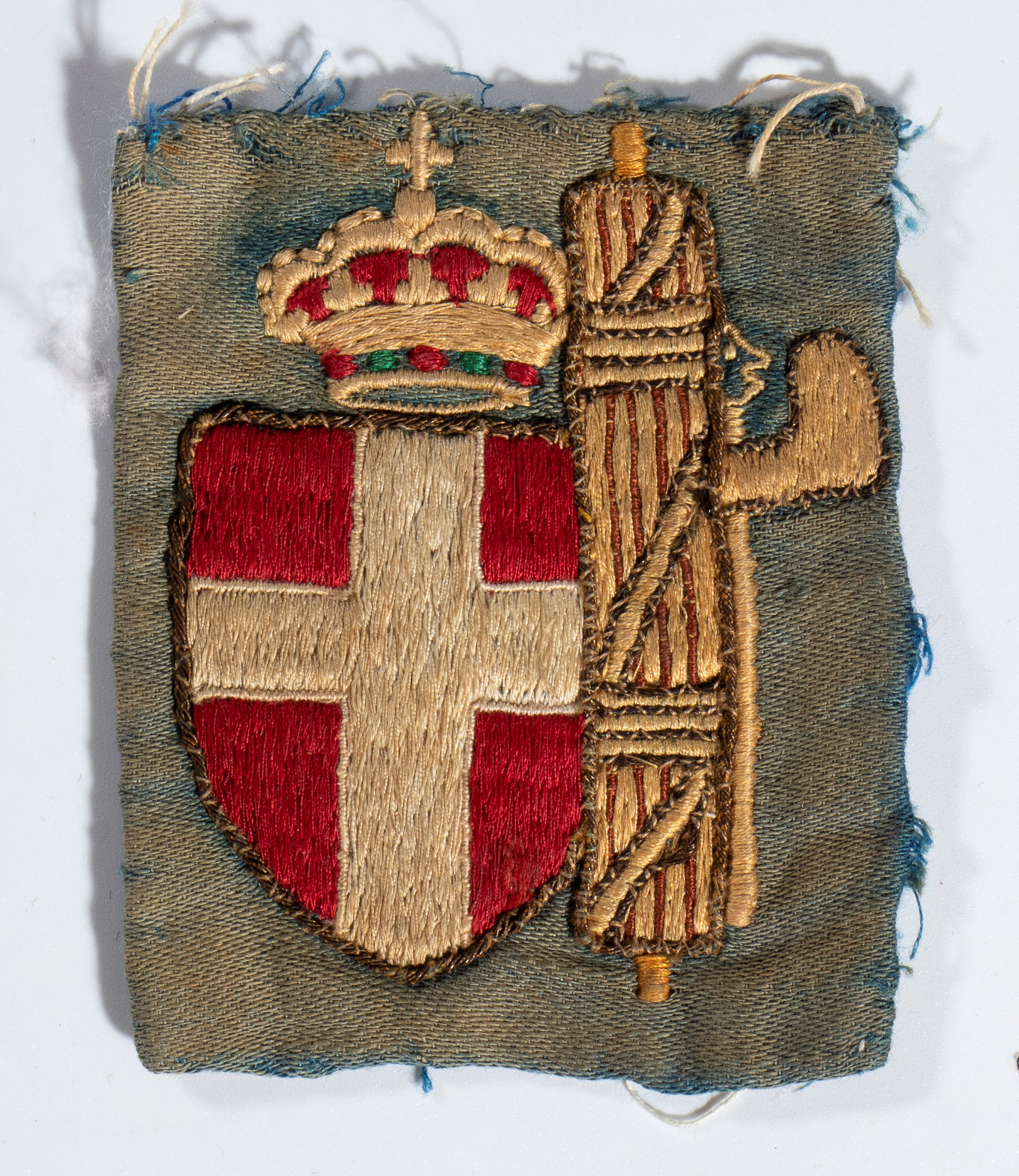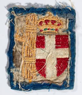 Magnificent Savoy shield surmounted by a Savoy crown, with the fasces at the right hip, embroidered in colored silk thread directly onto a strip of blue fabric. It can be worn on the jerseys of athletes, whether football, athletics, or Olympic athletes in general. Original from the Fascist period, it measures approximately 7 x 6 cm and is in good condition.