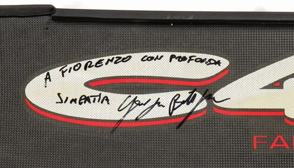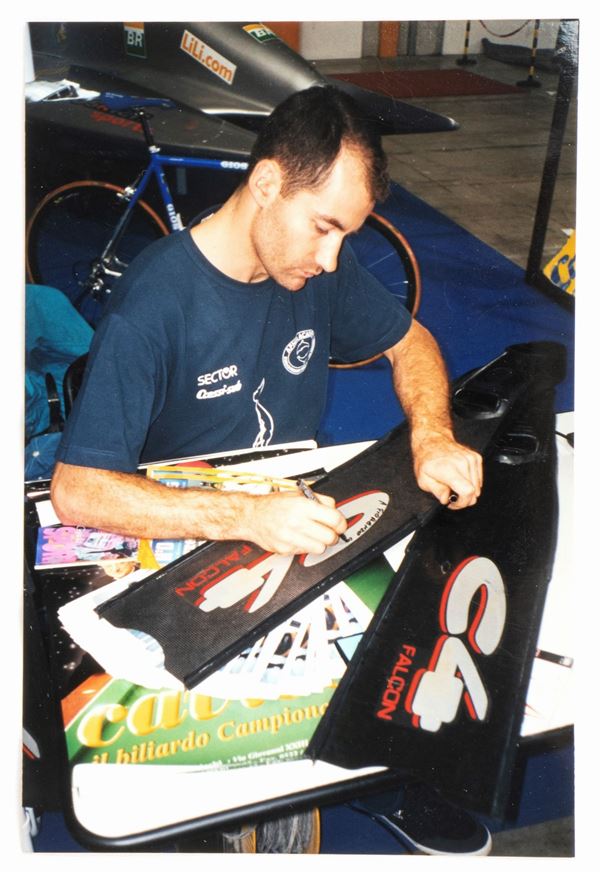 Depth fins belonging to Gaspare Battaglia, multiple freediving world champion, with original dedication and autograph written by Battaglia. FALCON C4 model fins, length approximately 105 cm - In addition, a photograph portraying Battaglia intent on autographing the fins in question. In good condition