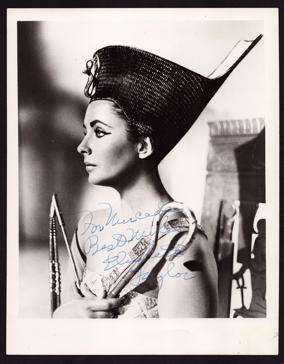 Elizabeth (Liz) Taylor (Dame Elizabeth Rosemond Taylor - London, February 27, 1932 โ€“ Los Angeles, March 23, 2011) beautiful black and white photo on glossy paper, in the guise of Cleopatra, with original dedication and autograph in blue ink. Photo dimensions: 21 x 27.5 cm.
