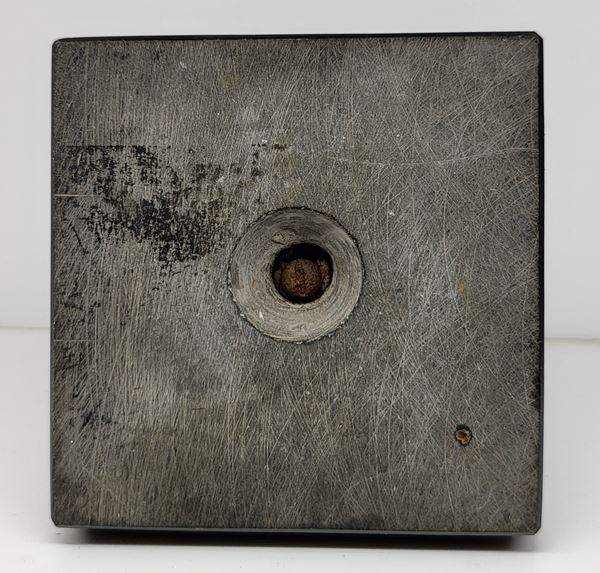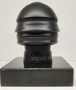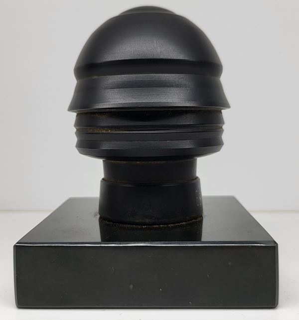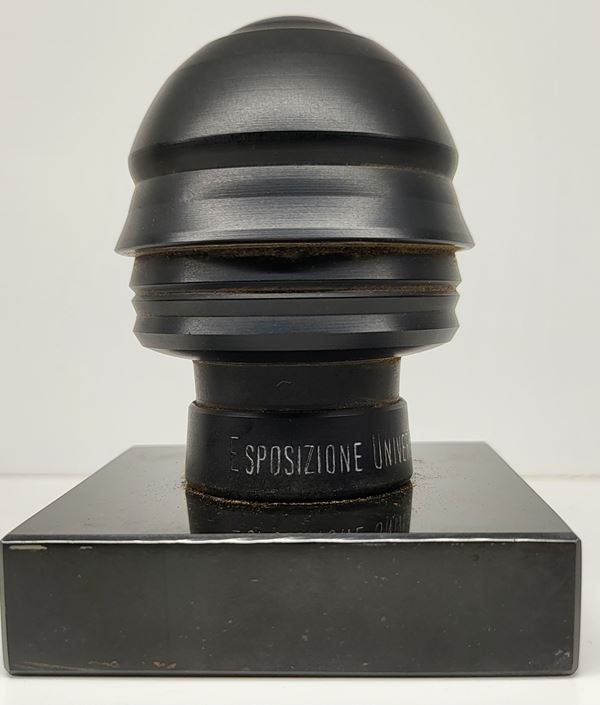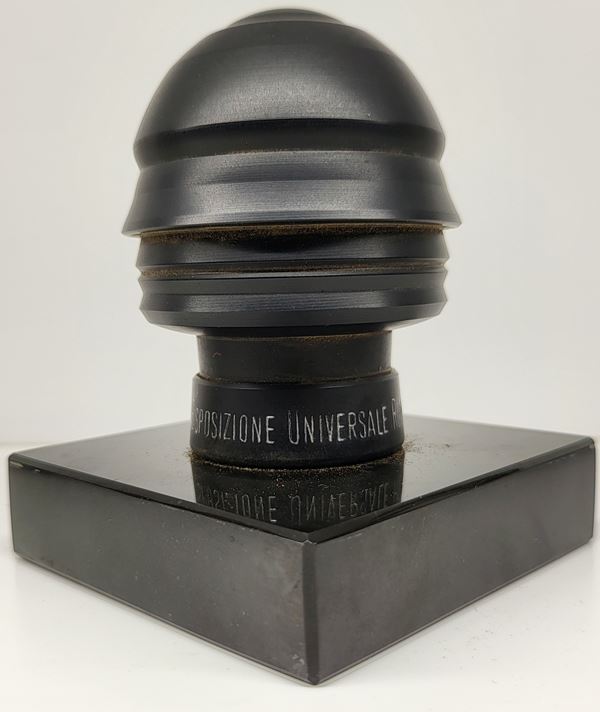 Made of self-sufficient material, mounted on a black marble base, original even in the central part with a round head that holds the "sculpture" to its base. The base measures approximately 8 x 8 x 2 cm, while the profile is 8 cm high and 6 cm in diameter.