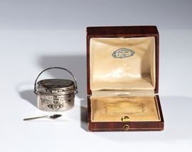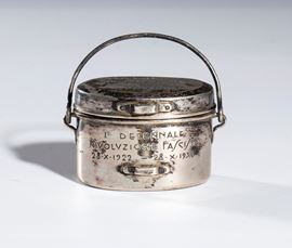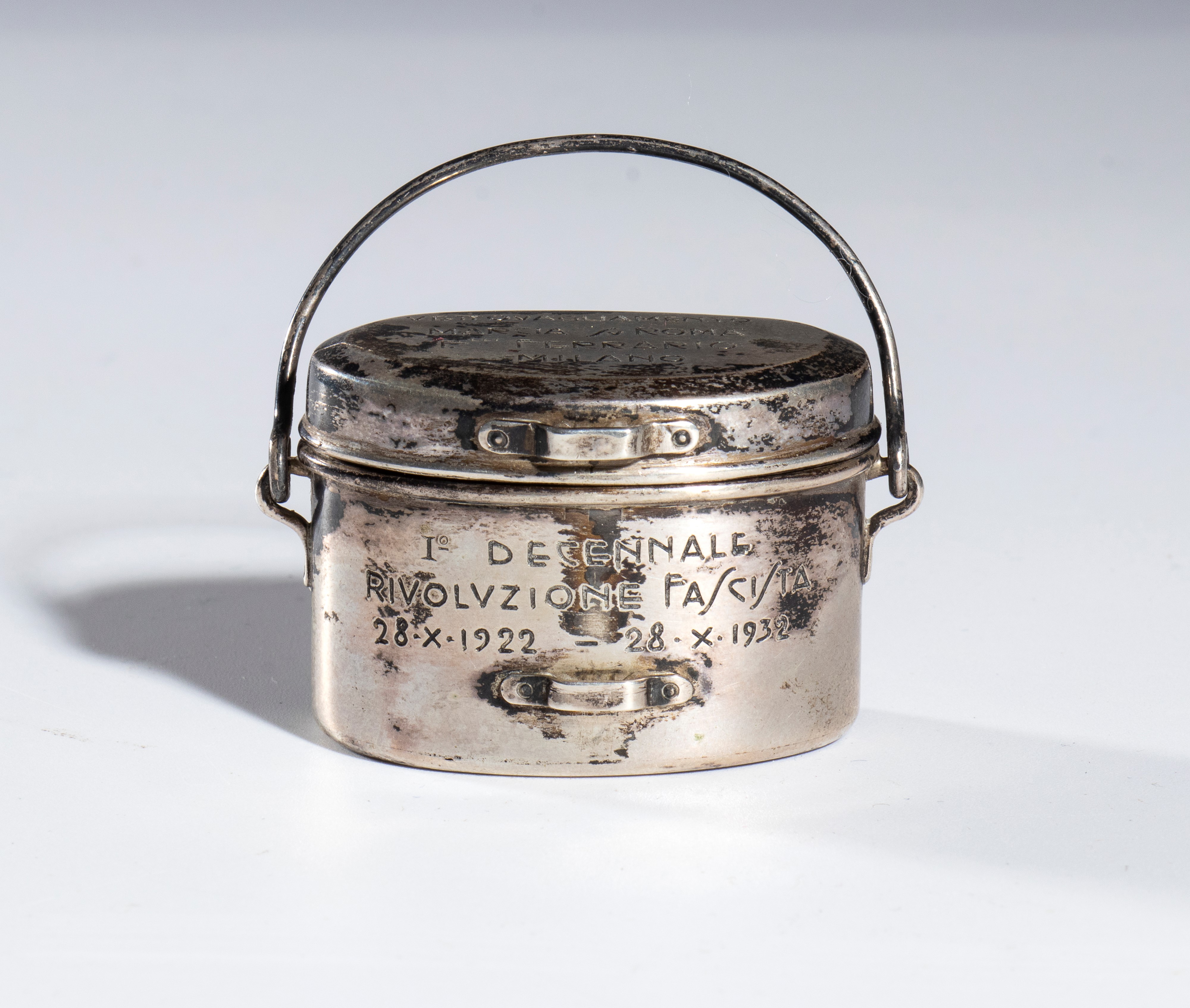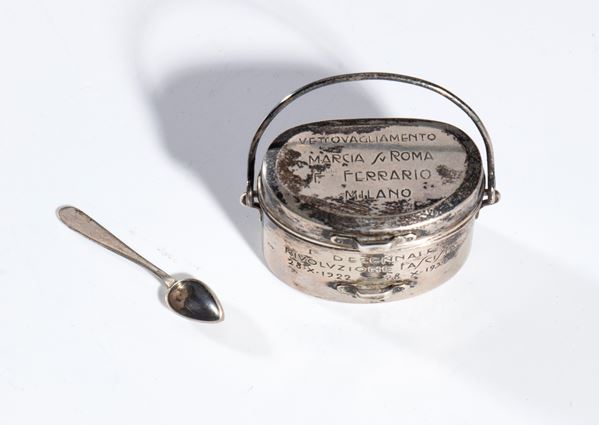 Commemorative gadget of the March on Rome, crafted in the shape of a mess tin with a lid and silver spoon. The small mess tin is engraved on the body with "FIRST DECADE OF THE FASCIST REVOLUTION 28 X 1922 - 28 X 1932" and on the lid with "PROVISIONS FOR THE MARCH ON ROME." Complete with its original box, stamped inside with "A. MICHELETTI - JEWELLER - MILAN."