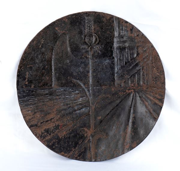 Circular metal plaque worked in relief, celebrating the reclamation works and the Battle of the Wheat of the twenty years of fascism. Painted in burgundy red, brown, black and golden yellow colors. Original from the 1930s, very interesting, with hook for wall display, measuring approximately 34 cm in diameter