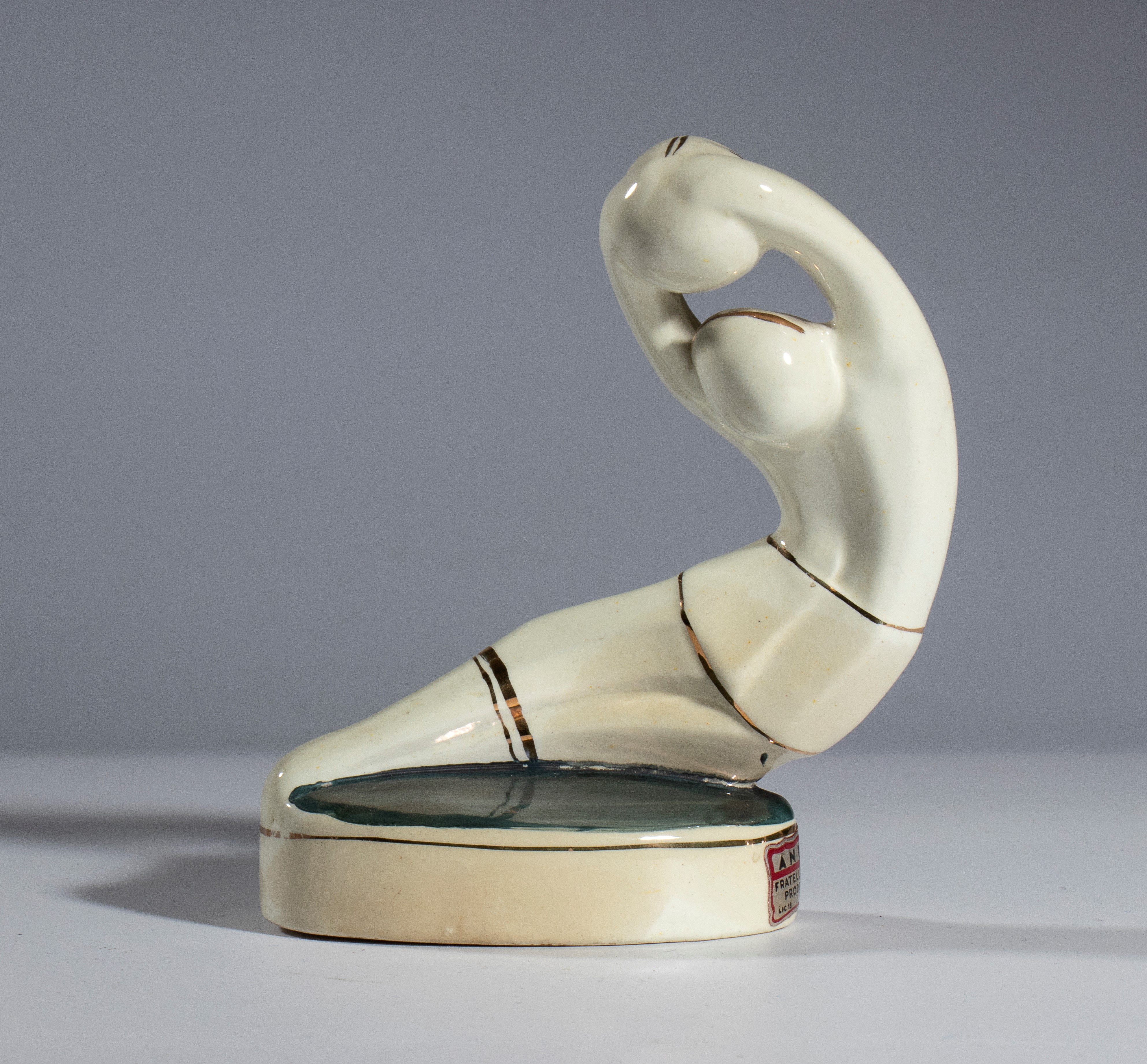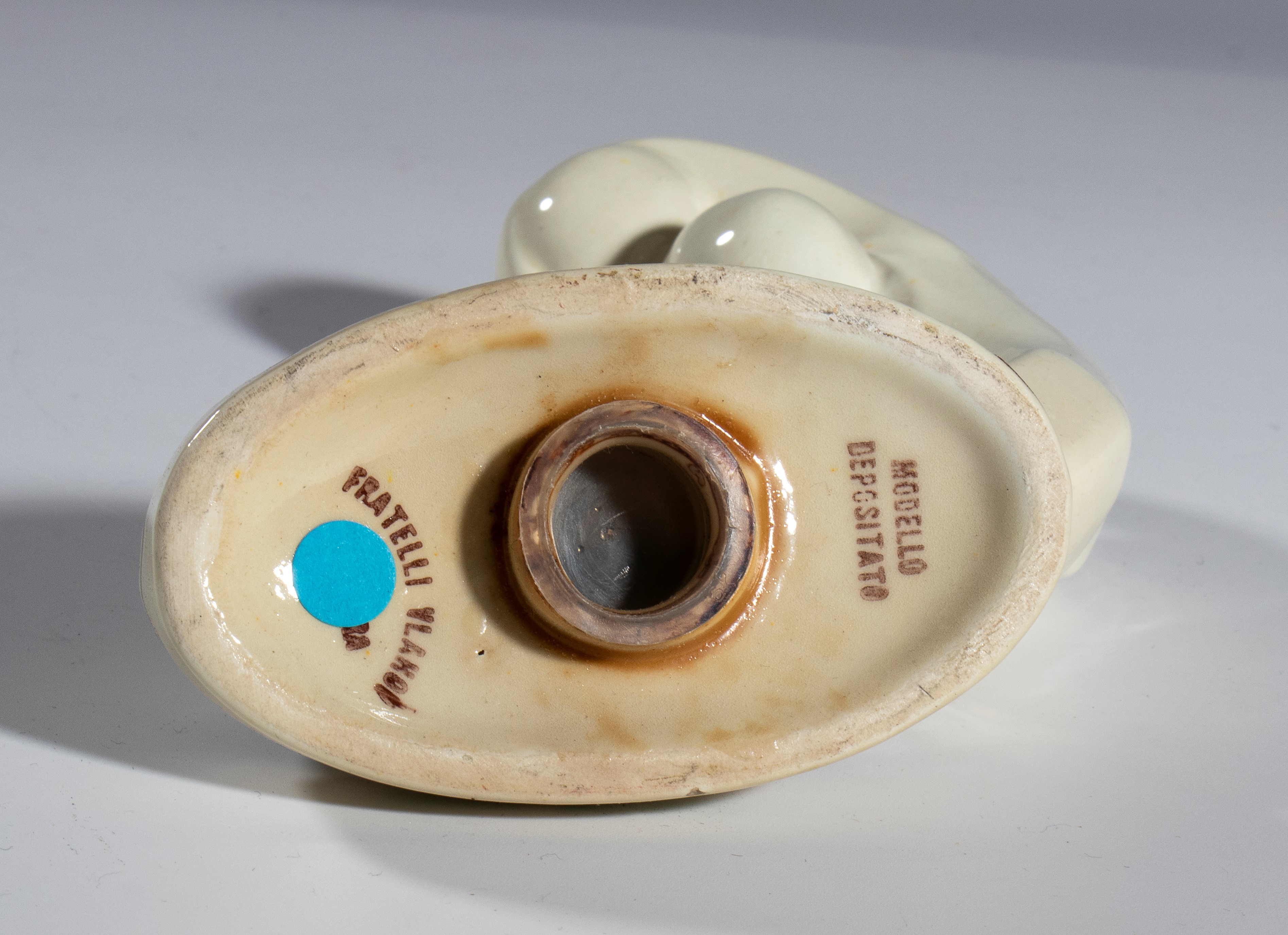 Promotional item from the 1960 Rome Olympics, miniature liqueur, polychrome ceramic sculpture depicting an Olympic athlete as a goalkeeper. Branded FRATELLI VLAHOV - PESCARA - REGISTERED MODEL. In perfect condition, measures approximately 13 x 15 cm.