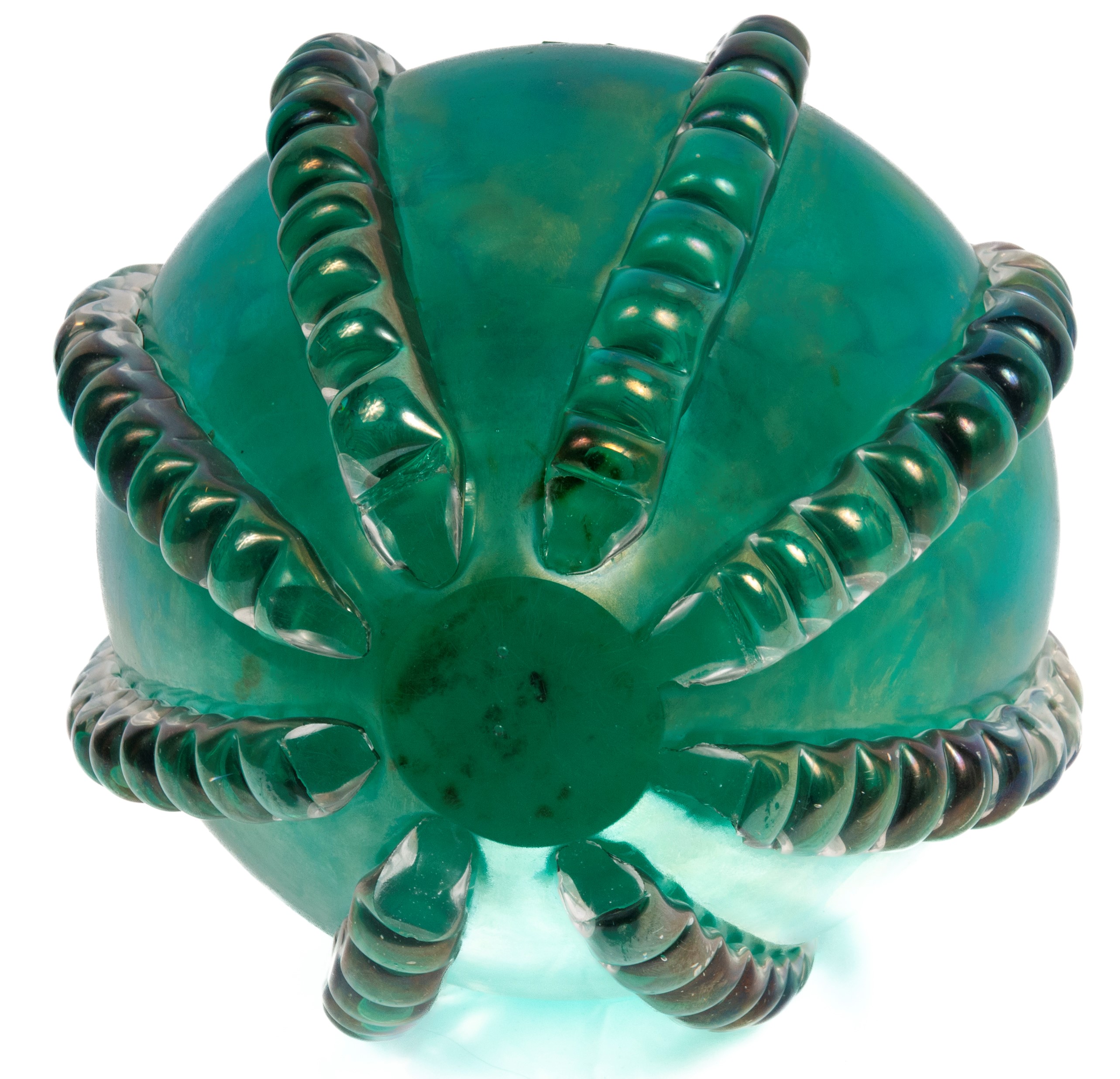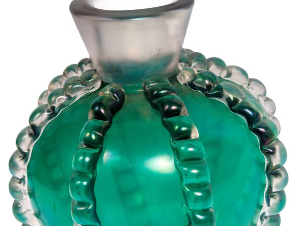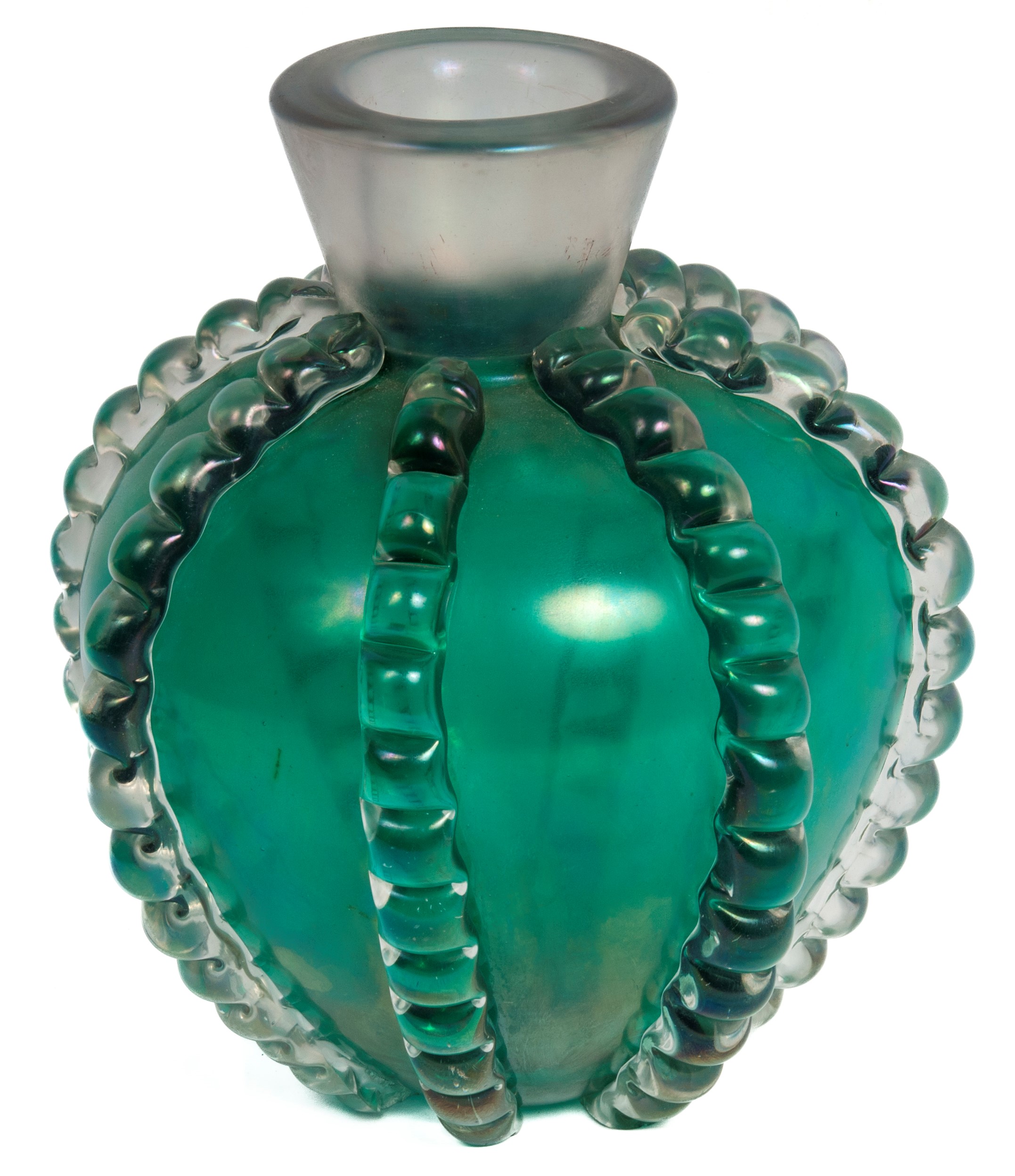 ovoid in shape with applied glass cords and a truncated conical neck.