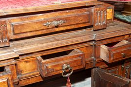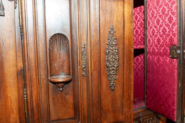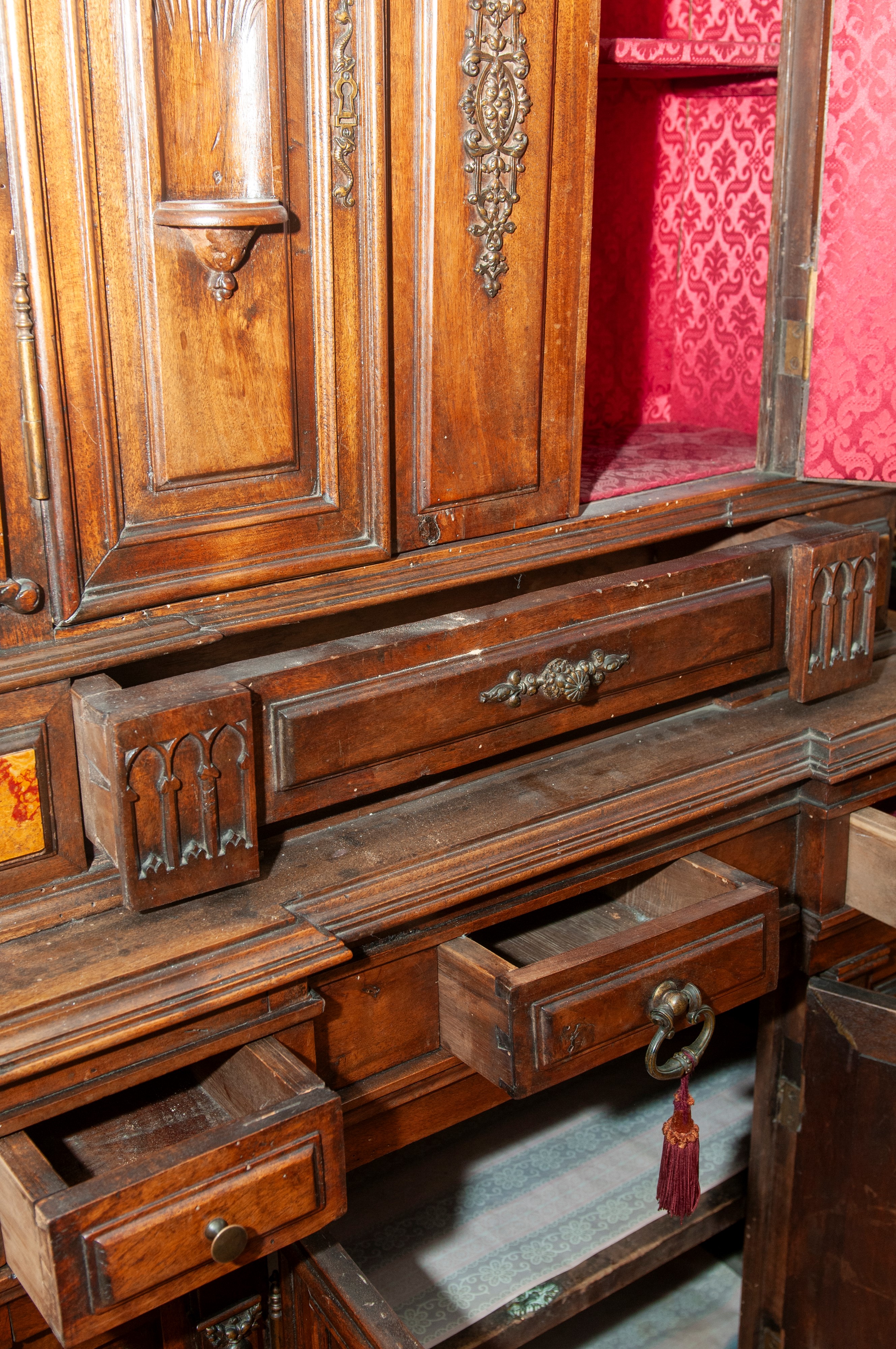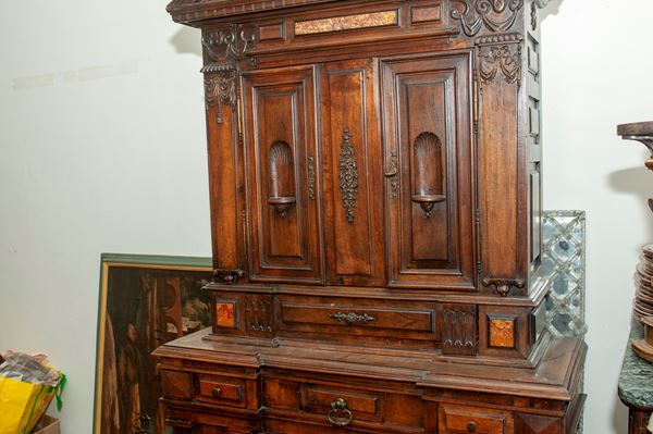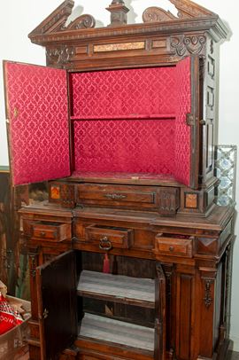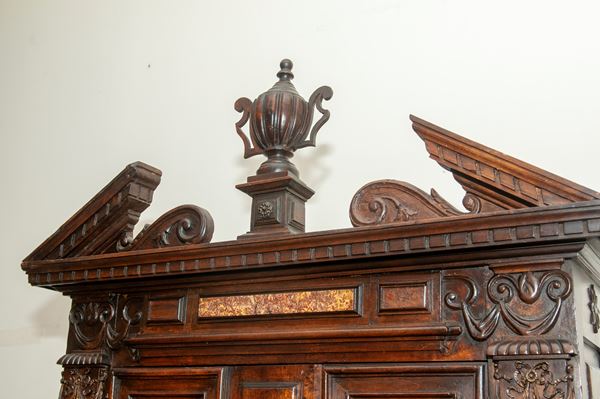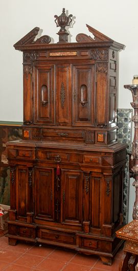 Rectangular architectural shape. Bracket-shaped legs, base with six drawers and two doors in the central body. Upper section with one drawer and two doors in the central body. Cymatium with a broken pediment, rusticated and pilasters with a central vase. The upper section features two niches and marble paneling.