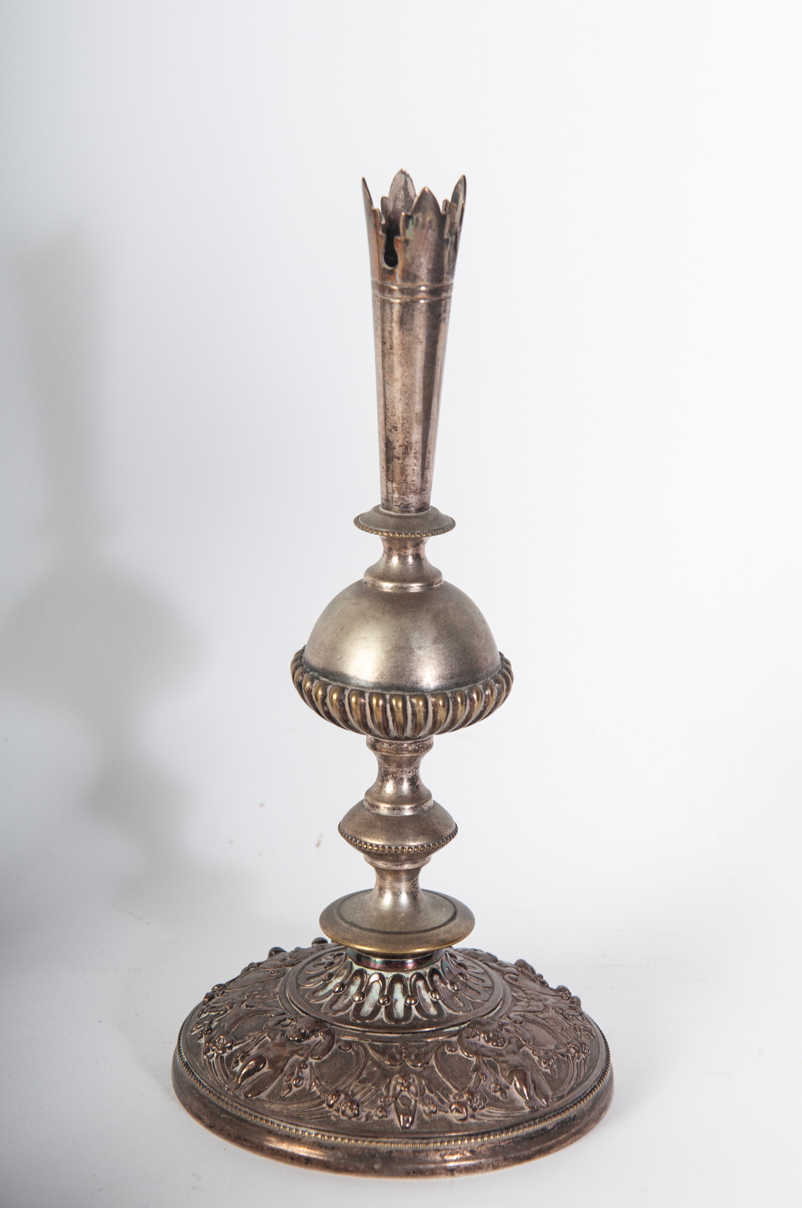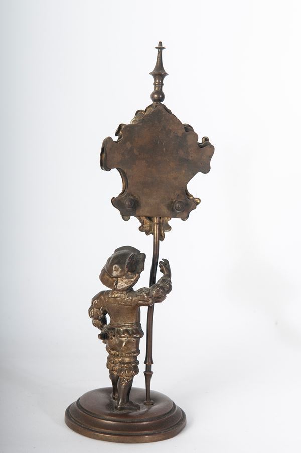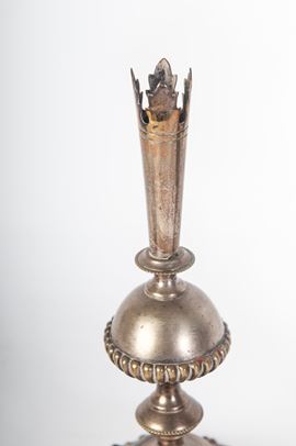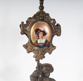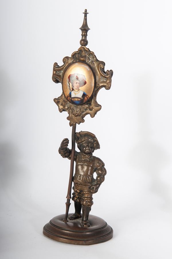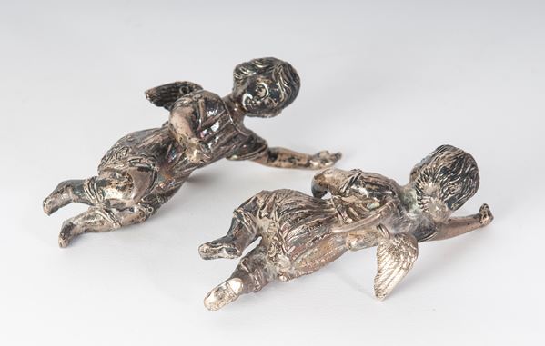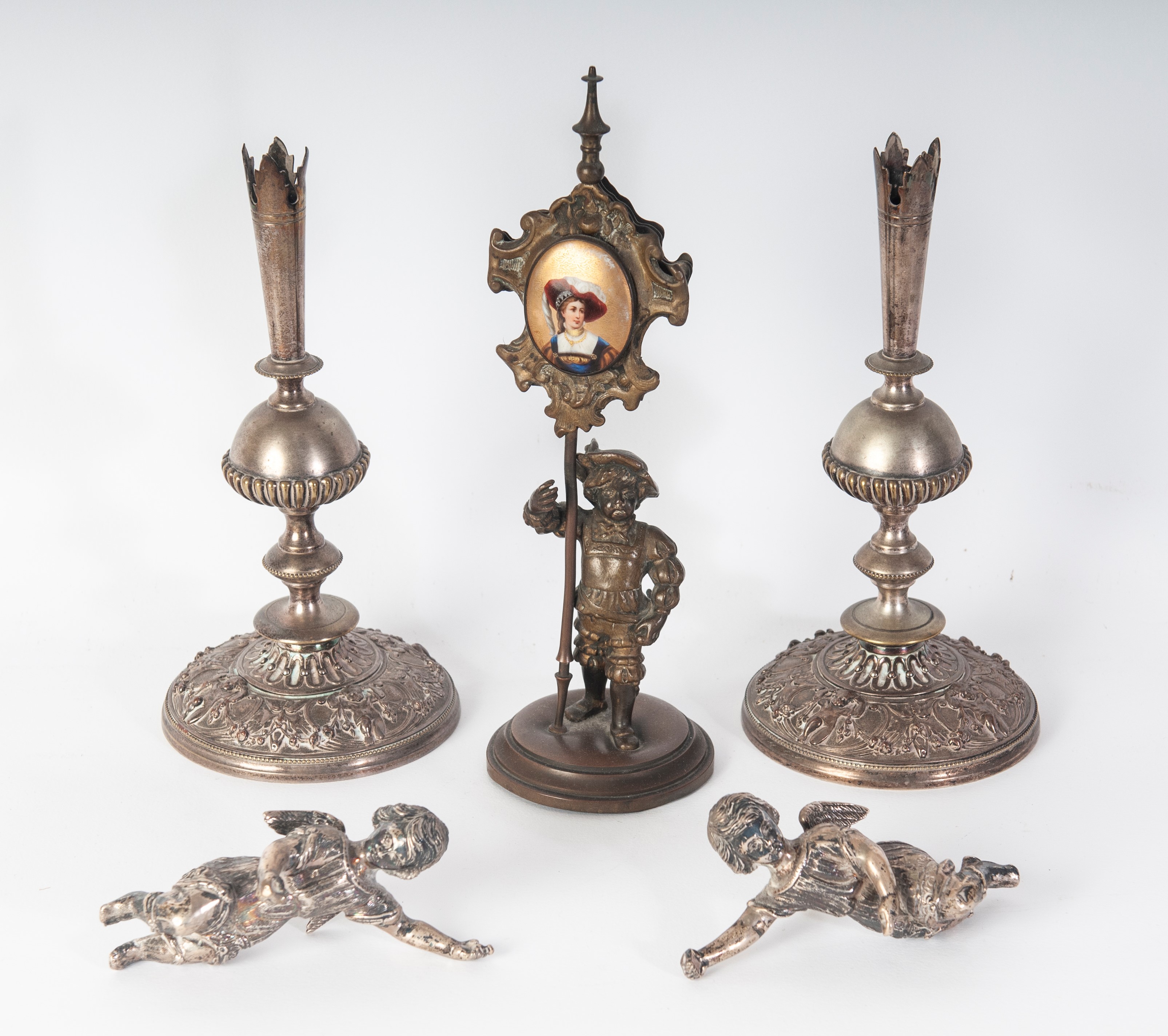 pair of flower holders 22 x 10.5 cm; pair of angels 11 x 3 cm; and a card holder with enameled portrait 25 x 7.5 cm.