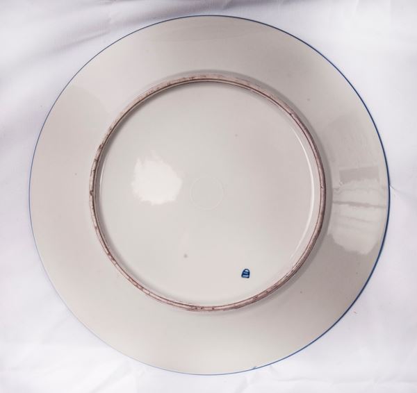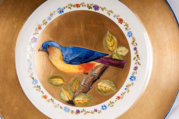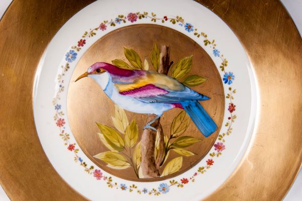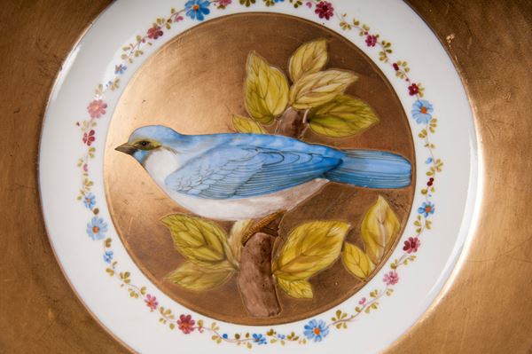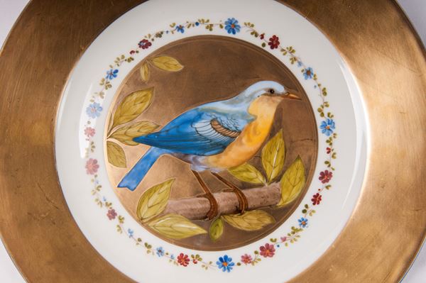 in polychrome porcelain with a golden brim and blue trim. Wide white-bottomed hollow with a reproduction of a bird within a golden reserve. Ring-shaped back on a lowered background with a blue manufacturing signature under the glaze.