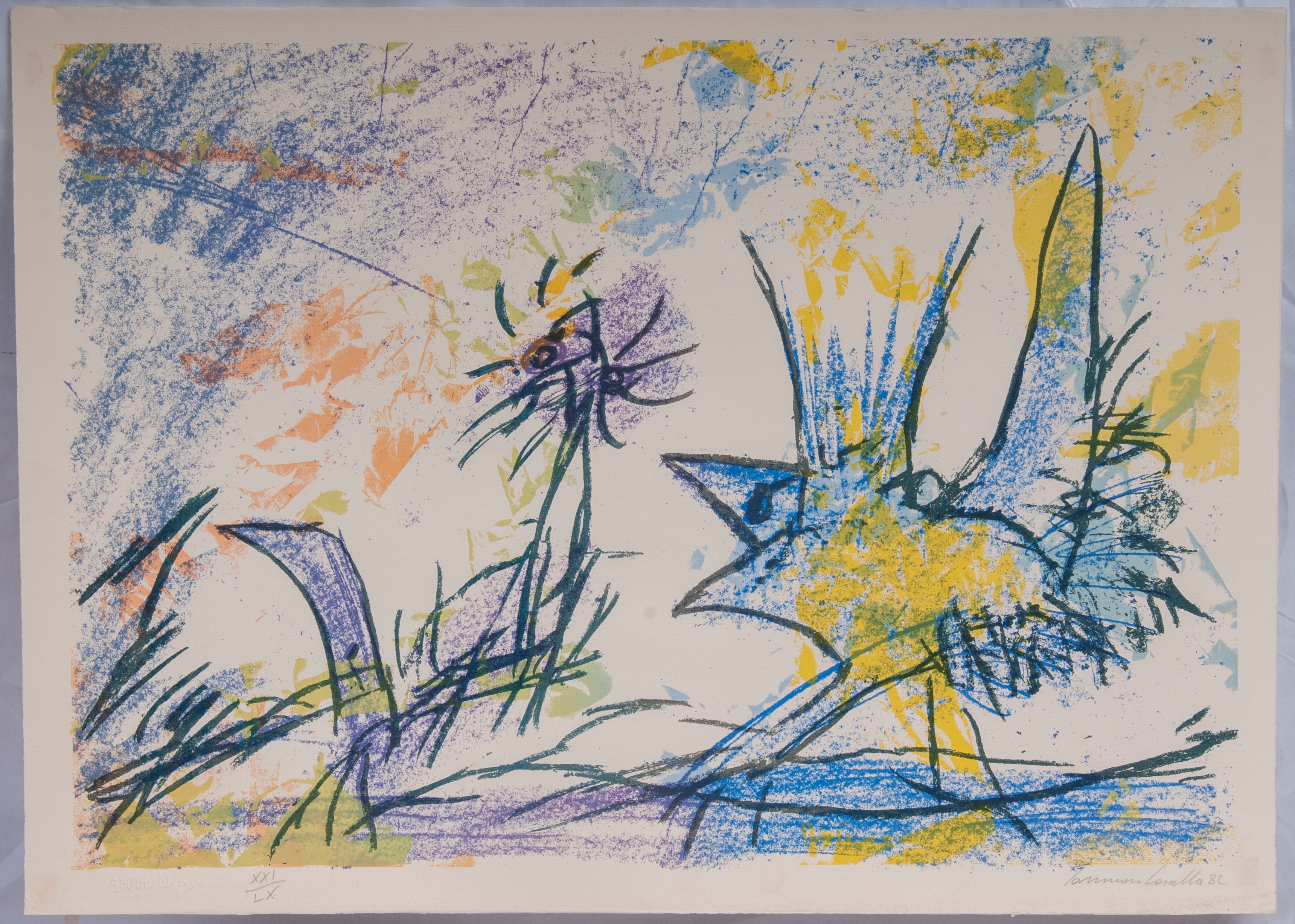 one signed by Cascella 1982 XXI/LX, the other signed by Fisher, framed.