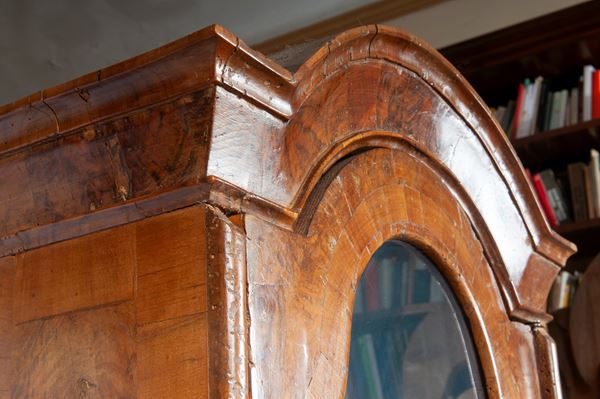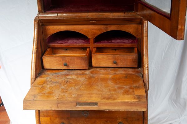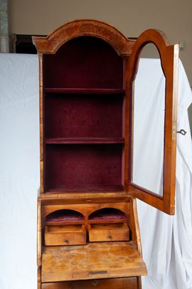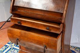 Rectangular in shape, with a curved base and three drawers and a drop-leaf with small drawers inside. The stand has one door and two shelves.