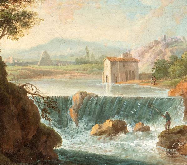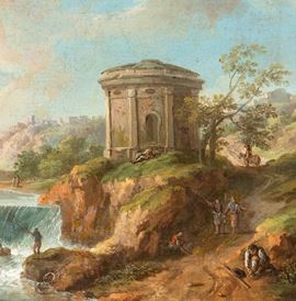 a) Fanciful view of the Roman Campagna, with fishermen by a stream and a village; b) Fanciful view of the Roman Campagna, with fishermen, small waterfalls, and a circular temple. A pair of paintings