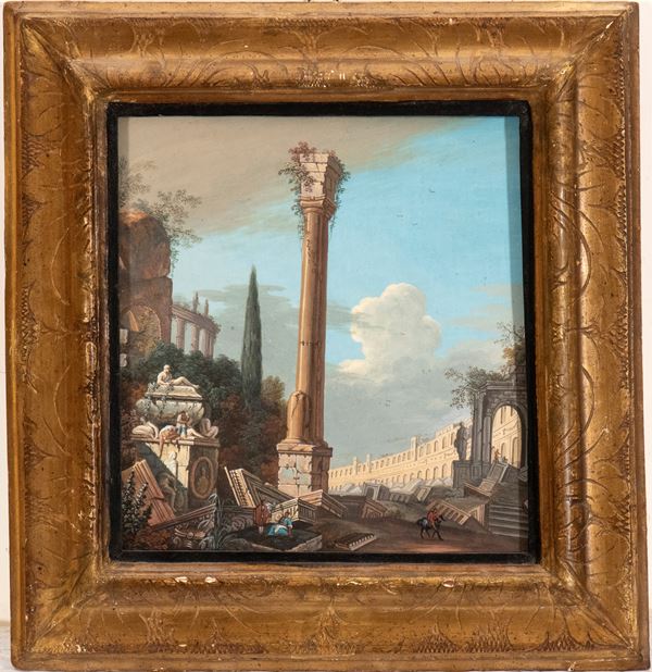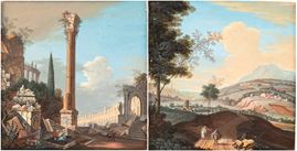 a) Countryside landscape with travellers; b) Architectural capriccio with ruins and figures. Pair of paintings