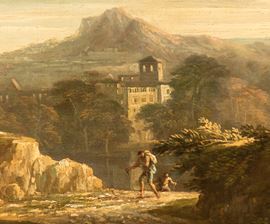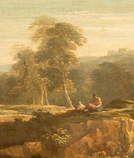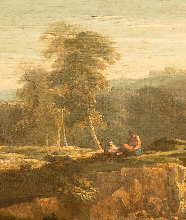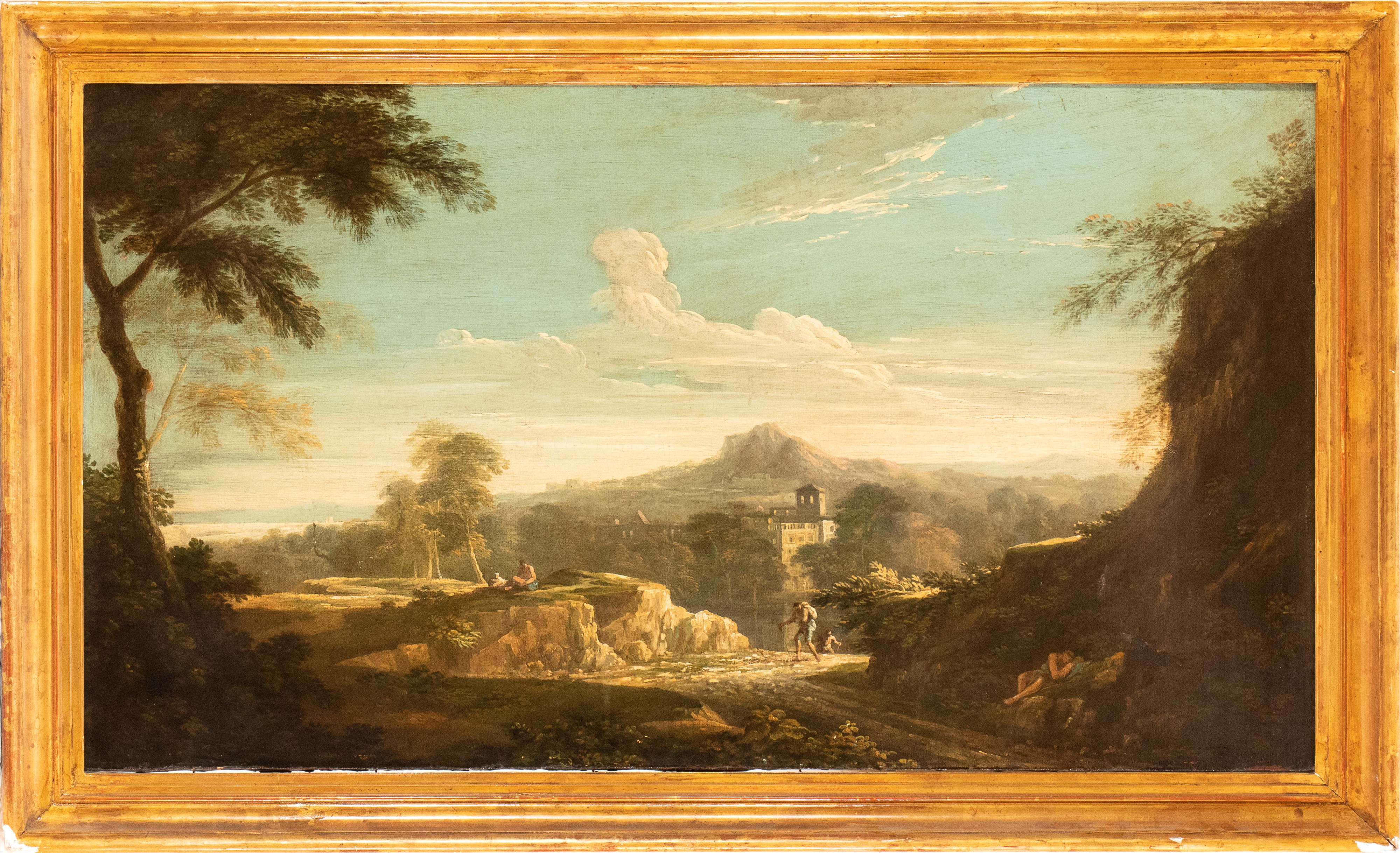 Questo luminoso paesaggio con figure mostra un'articolata combinazione di influenze, caratteristico della migliore paesaggistica romana del Settecento, in cui si intrecciano gli esempi di Salvator Rosa, Dughet, Lorrain e soprattutto Van Bloemen. Il raffinato equilibrio della composizione, i colori chiari, il delicato lirismo della scena richiamano da vicino il nitore e la grazia tipiche dei paesaggi di Andrea Locatelli.