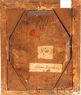 The painting bears a wax seal on the reverse, along with two old labels (cartouches) featuring an inventory number and attribution: "N. 4J /CORTONA / 1596-1669" and "PIETRO DA CORTONA".