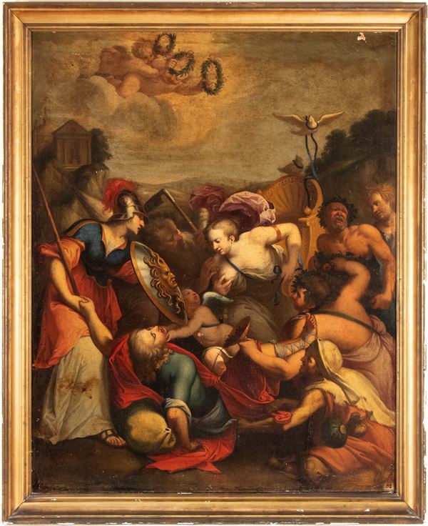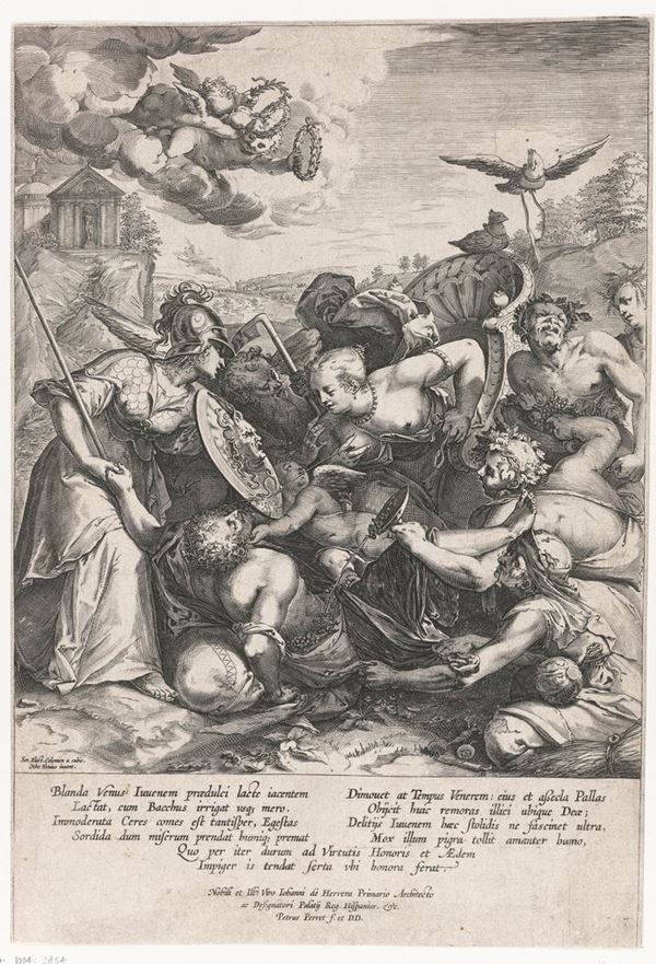 This painting, with its highly unusual iconography, is closely based on an idea by Otto van Veen, translated into print by Pieter Perret. The allegorical composition places the shepherd Syphilus at the center, surrendered to bodily pleasures and intoxication—an emblem of vulnerable mankind—besieged by the personifications of Venus (carnal love), Bacchus (intoxication), Ceres (gluttony), Poverty, Death, and Time. On the left, an armed Minerva attempts to pull Syphilus away, flanked by putti descending from the heavens bearing a laurel wreath and a palm—traditional rewards of virtue. The classical temple in the background, identified as Apollo’s, may also allude to the soul’s ascent toward knowledge and inner balance. The painting visualizes the moral and philosophical content of Syphilis sive de morbo gallico (1530), the Latin poem by Girolamo Fracastoro, a Veronese physician and poet. In the poem, Syphilus is a young shepherd who refuses to venerate Apollo, and is punished by the god with a new and terrible disease, marked by ulcerations and bodily deformities. The poem is not only a literary work but also a medical treatise on a newly emerging illness, described with great precision, to which the author gave the name “syphilis,” deriving it from the name of the protagonist.