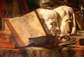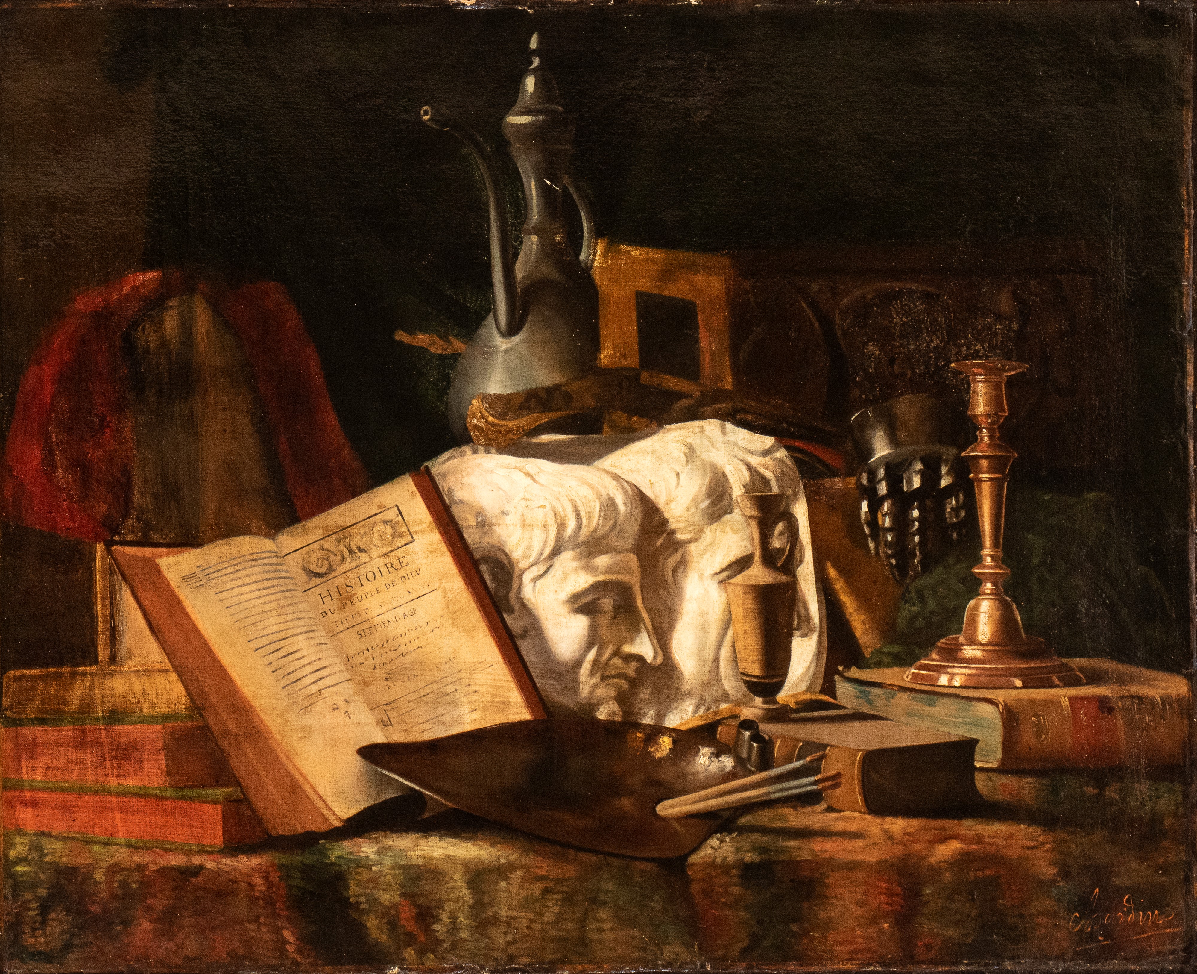 Vanitas with books, plaster casts, teapot, and palette