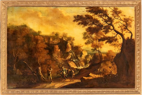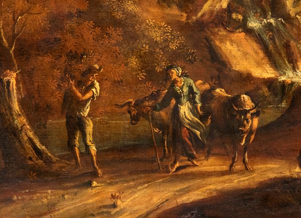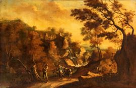 Landscape with a pair of shepherds, livestock, and waterfalls in the background