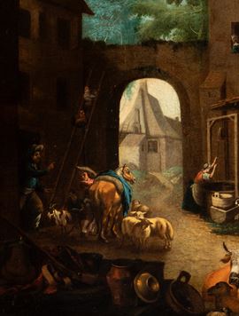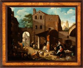 Courtyard Scene with Figures, Animals, and a Church in the Background.
