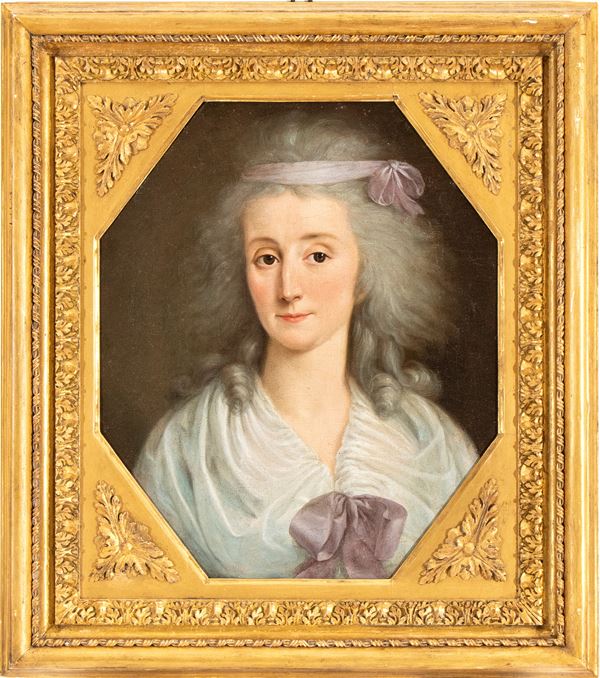 Come proposto da Liliana Barroero, i caratteri stilistici di questo dipinto suggeriscono di riferirlo alla tarda produzione di Pompeo Batoni. Chiare risultano le affinità con il Ritratto della principessa Cecilia Mahony Giustiniani del 1785, oggi alla National Gallery of Scotland di Edimburgo. La giovane mostra un ovale affilato, occhi lievemente sporgenti e un naso sottile. Il suo abito bianco, decorato da un fiocco lilla coordinato con l’acconciatura, è eseguito con tocchi pittorici rapidi e sintetici, mentre il trattamento pittorico del volto, incorniciato da una parrucca bianca incipriata, risulta più accurato e definito. Un taglio sul lato sinistro della tela, oggi restaurato, segue la forma del telaio originale, suggerendo che il raro formato ottagonale sia quello originale scelto dall'artista.