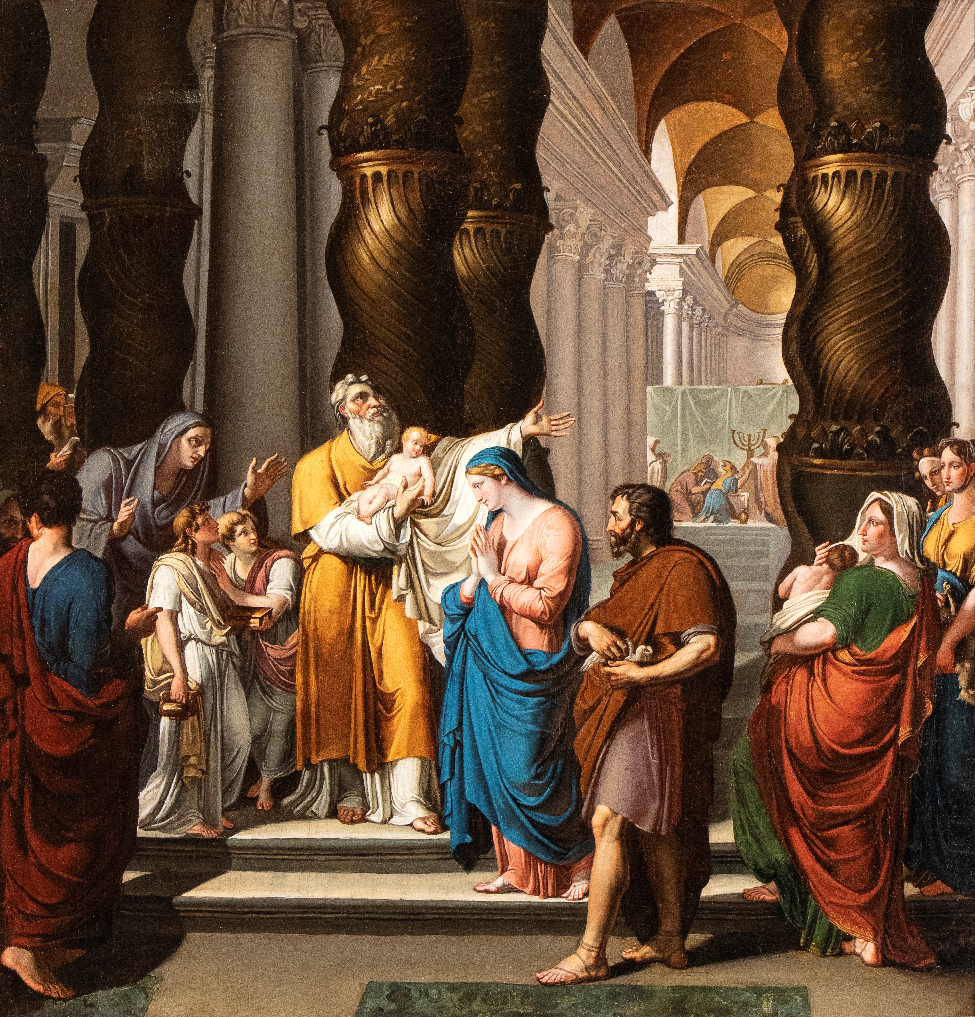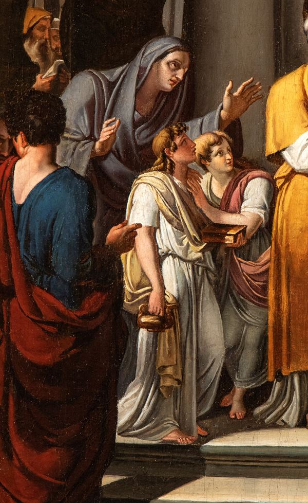 This work, attributable for its stylistic features and vibrant coloring to a member of Vincenzo Camucciniโs atelier, is a faithful and early replica of the painting executed by the master in 1808 for the Neoclassical Chapel of the Rosary in the church of San Giovanni in Canale in Piacenza, where it is still preserved.