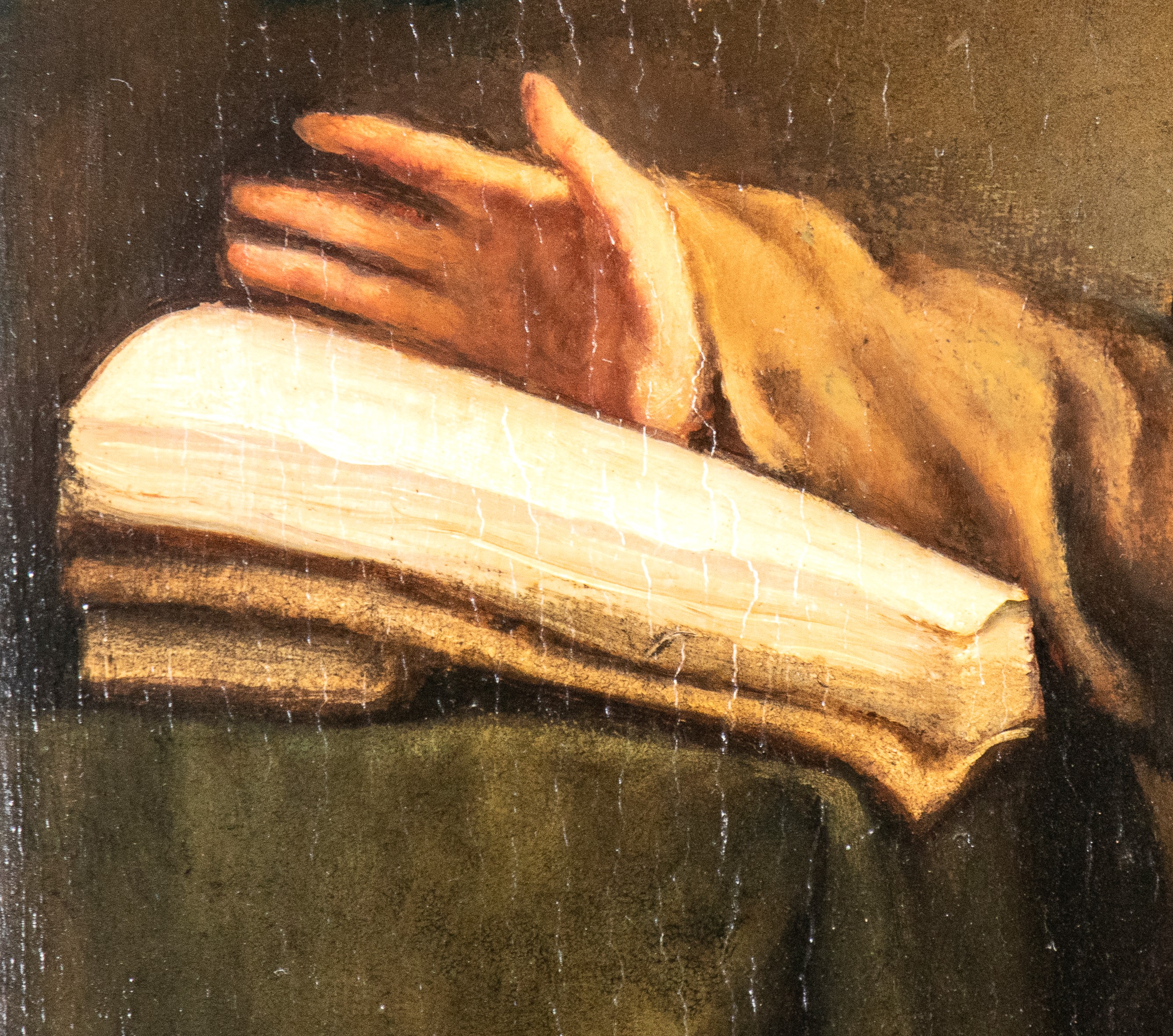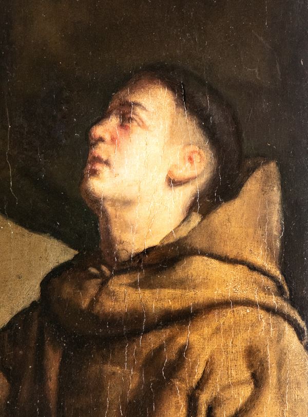 Recognized by Prof. Nicola Spinosa as an autograph work by Bernardo Cavallino, this refined panel is an intimate variant—smaller and compositionally reversed—of the celebrated painting at the Museo di Capodimonte. The work displays the artist’s mature grace and luminous tenderness, hallmarks of his style after 1645. The delicate play of light, the soft gestures, and the inclusion of symbolic details such as the open book and the white lily evoke Cavallino’s poetic spirituality and his refined, Venetian-inspired classicism. A painting of rare elegance and emotional depth, likely created for private devotion, it exemplifies the lyrical sensibility that made Cavallino one of the most sophisticated masters of 17th-century Neapolitan art.