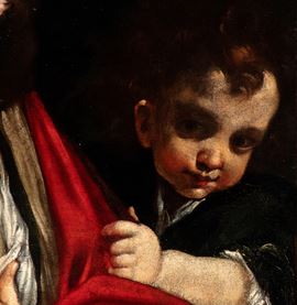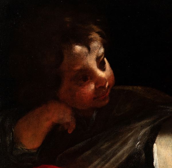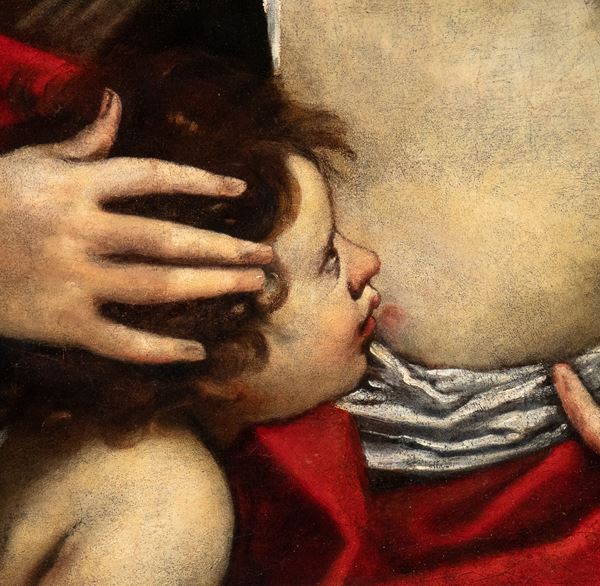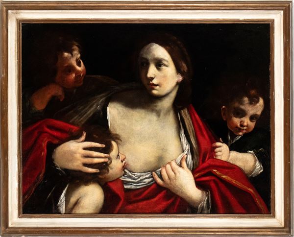 This delicate and intense oil on canvas, depicting a tender Allegory of Charity, is attributed to Giacomo Cavedone by Emilio Negro, who dates the work to the artist's full maturity (circa 1615). The painting showcases Cavedone's celebrated stylistic synthesis, combining the Carracci tradition with Venetian colourism and Guercinesque naturalism. The use of warm tones and golden light reflects his major works, such as the Bavosi Chapel frescoes. Significantly, the canvas is plausibly identified as the CaritΓ con tre putti previously in the Garimberti collection in Parma, before entering in the historic Farnese Collection (E. Negro, N. Roio, Giacomo Cavedone, pittore 1577 - 1660, Modena 2001, p. 186, cat. nn. 357 e 364).