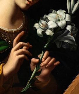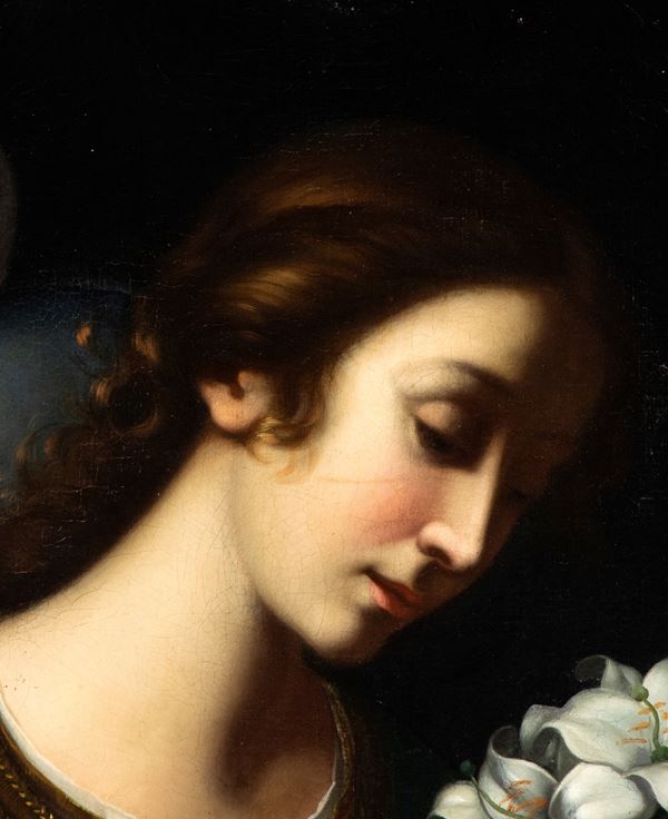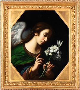 This exquisite painting has been attributed to Carlo Dolci by Professor Sandro Bellesi, who recognizes in it the refined execution and luminous clarity typical of the masterโs devotional works. The youthful archangel, identifiable as Gabriel by the white lilies, is rendered with Dolciโs meticulous realism and smooth, porcelain-like finish. Closely related to the Announcing Angel in the Uffizi Galleries, the work likely dates to the early 1650s, during the artistโs mature period.