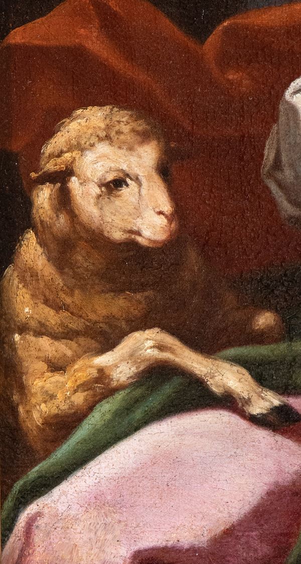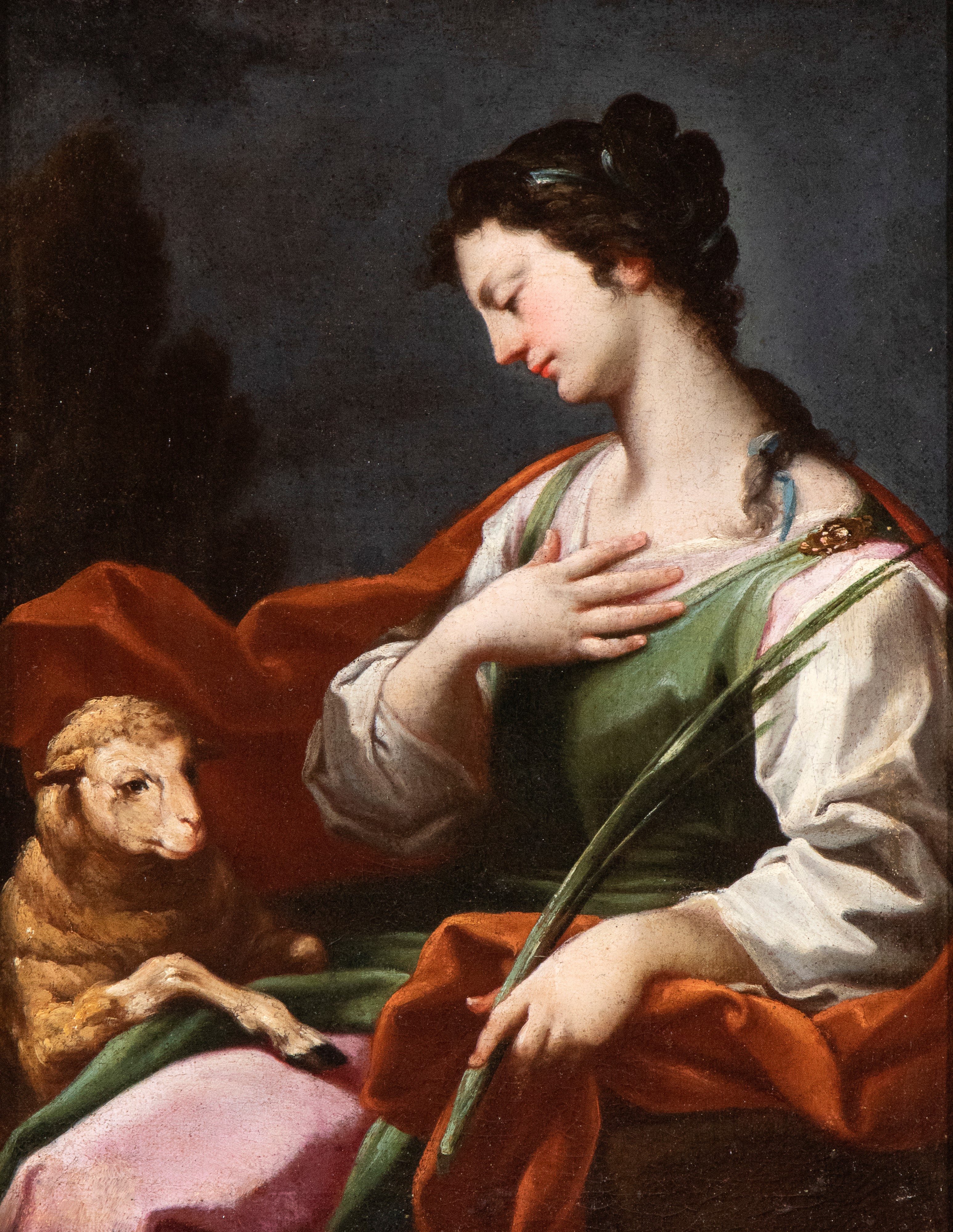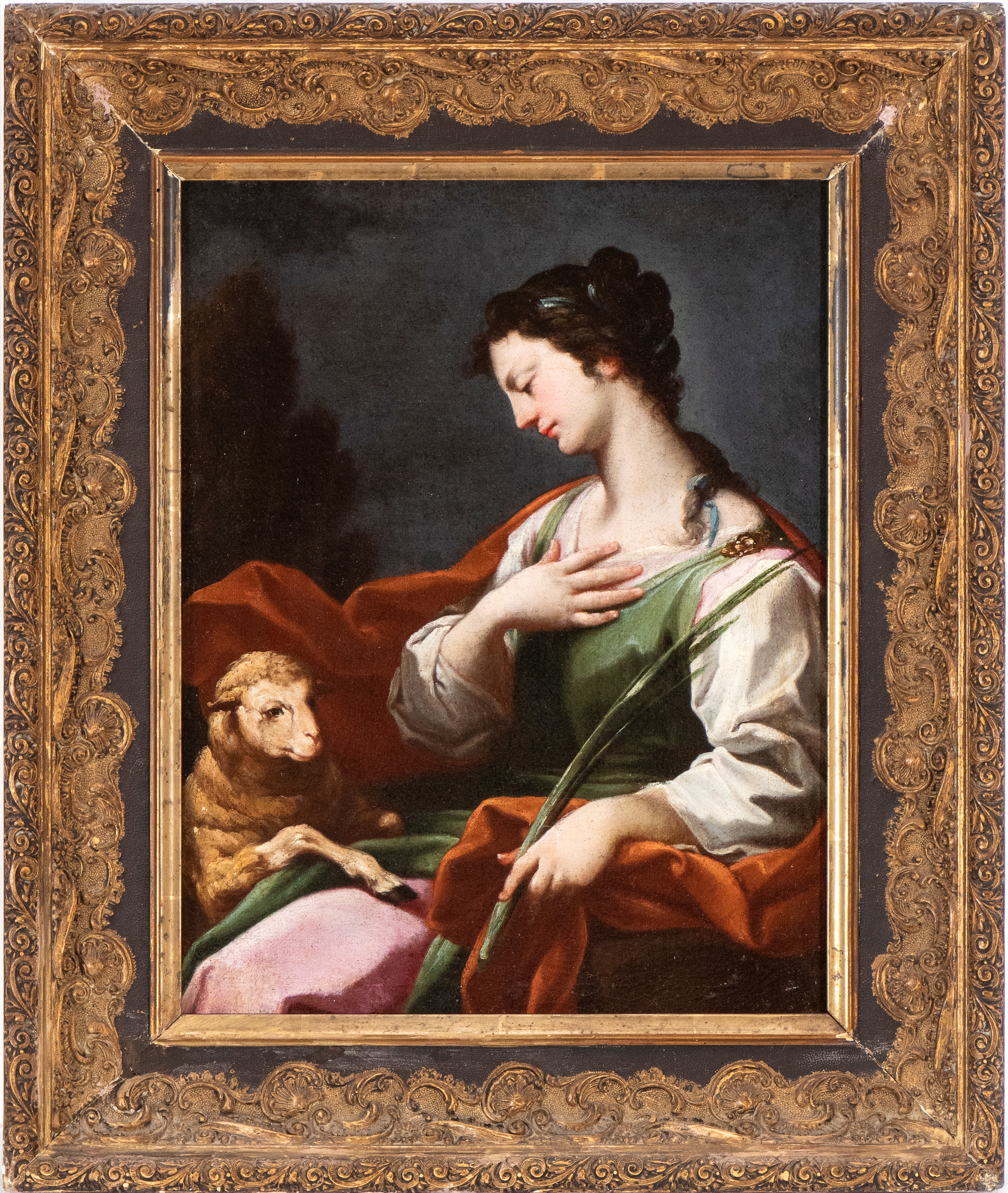 Questo raffinato dipinto di destinazione privata raffigura a mezzo busto Sant’Agnese vergine e martire accompagnata dall’agnello, suo attributo distintivo, che solleva una zampa sulle gambe della fanciulla assisa e indirizza lo sguardo verso la palma. L’ovino appare dipinto dal vivo con grumi materici di colore che mostrano echi della pittura animalista di Rosa da Tivoli. La nostra Sant’Agnese è trasformata qui in un’arcadica pastorella, da cui però trapelano in controluce anche le valenze morali della figura allegorica della Mansuetudine. Dalla tela emerge la vasta cultura figurativa di Giaquinto, che combina i riferimenti a Solimena con un raffinato colorismo di marca veneta e suggestioni romane che coinvolgono Luigi Garzi e Benedetto Luti e indirizzano l’opera verso un elegante registro classico. Evidenti i legami stilistici che accostano il nostro dipinto a opere certe del Giaquinto come l’Allegoria della Pace della Casita del Principe dell’Escorial, l’Immacolata Concezione delle Gallerie dell’Accademia di San Luca in Roma, la Madonna della Pietà in collezione privata a Molfetta o l’Allegoria della Prudenza, della collezione della Cattolica Popolare di Molfetta.