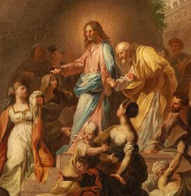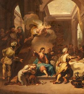 The painting (a) is closely derived from the work by Jean Jouvenet with the same subject, executed in 1706 for the church of Saint-Martin-des-Champs, and today conserved at the Musรฉe des Beaux-Arts in Lyon. The painting (b) is closely derived from the work by Jean Jouvenet with the same subject, executed in 1707 for the church of Saint-Martin-des-Champs, today conserved at the Louvre Museum in Paris, known also in the smaller version today at the Los Angeles County Museum of Art.