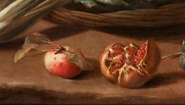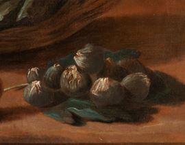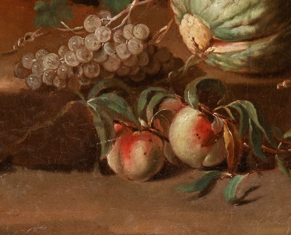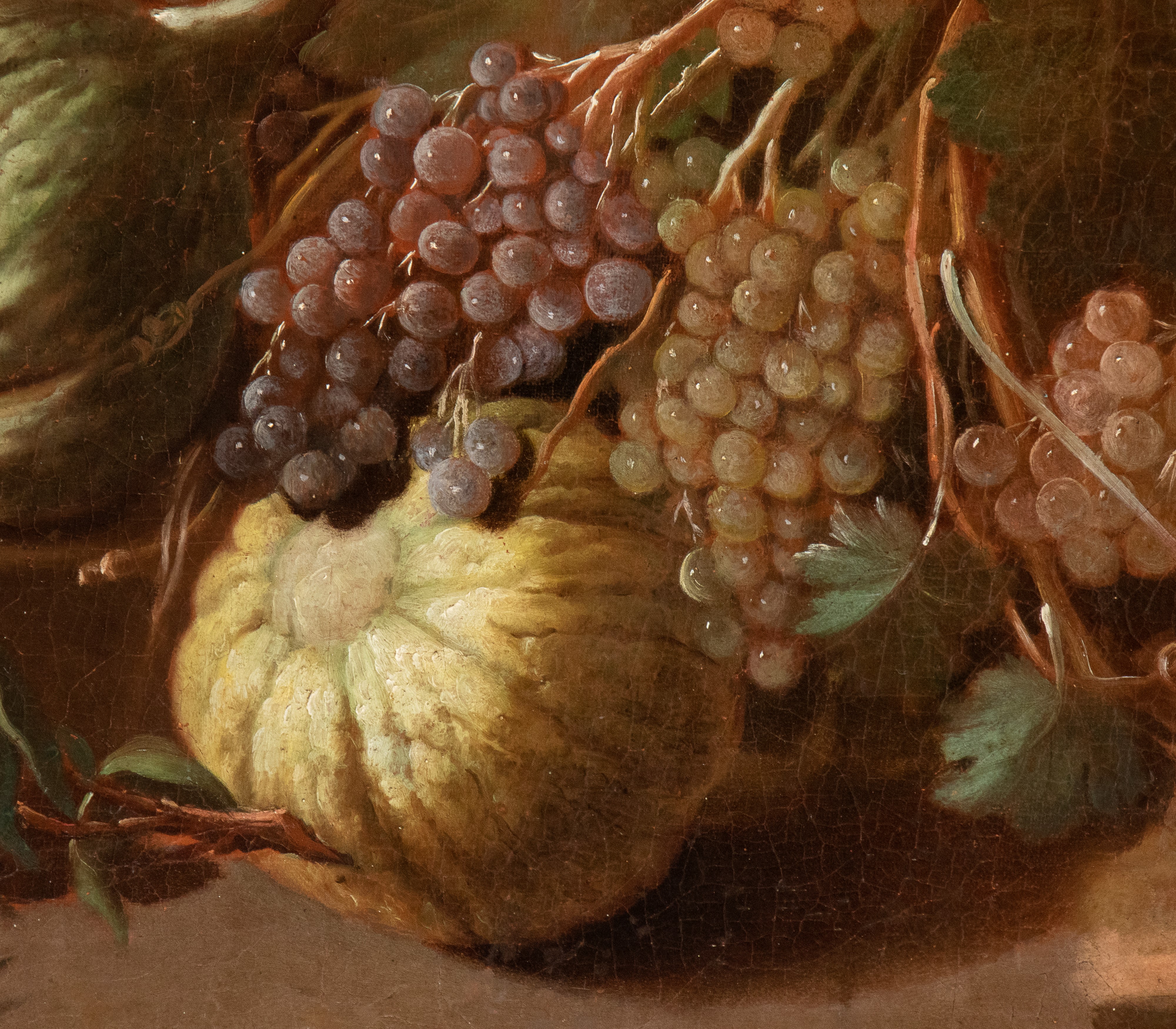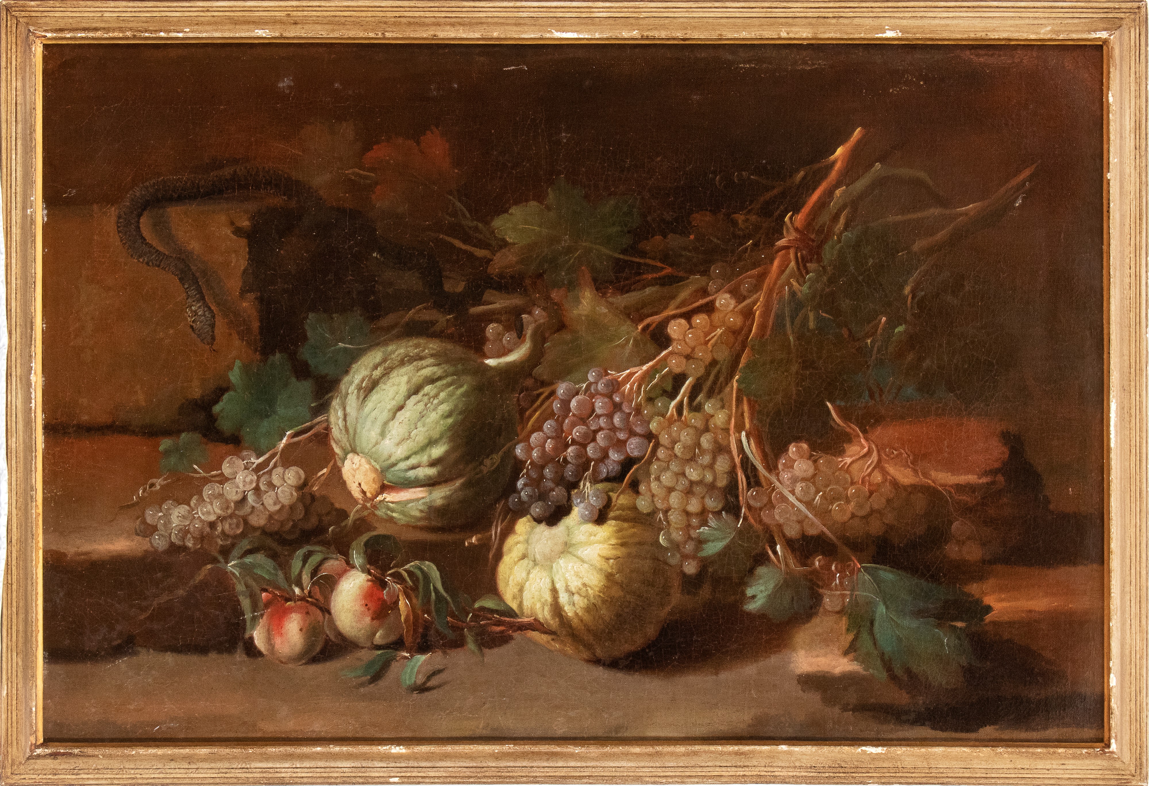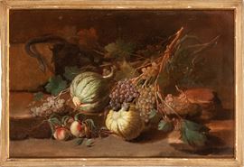 a) Still life with grapes, pumpkins, peaches, and a snake; b) Still life with cabbage, celery, pomegranates, and figs. Pair of paintings