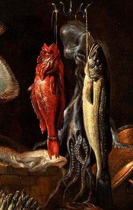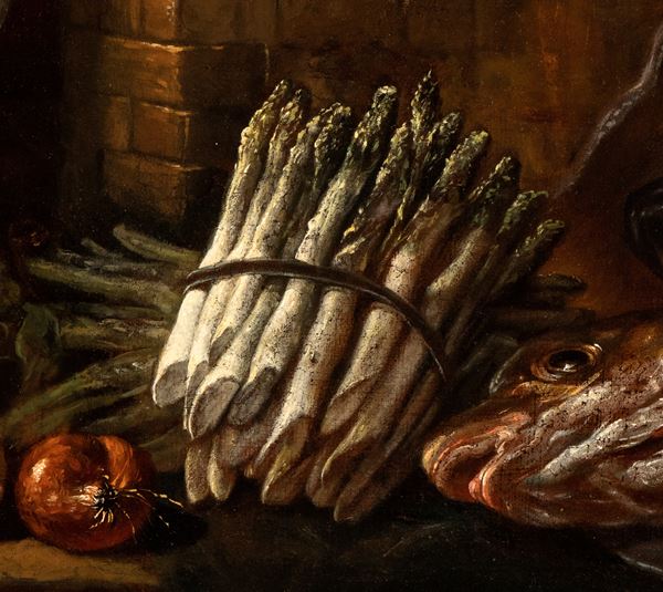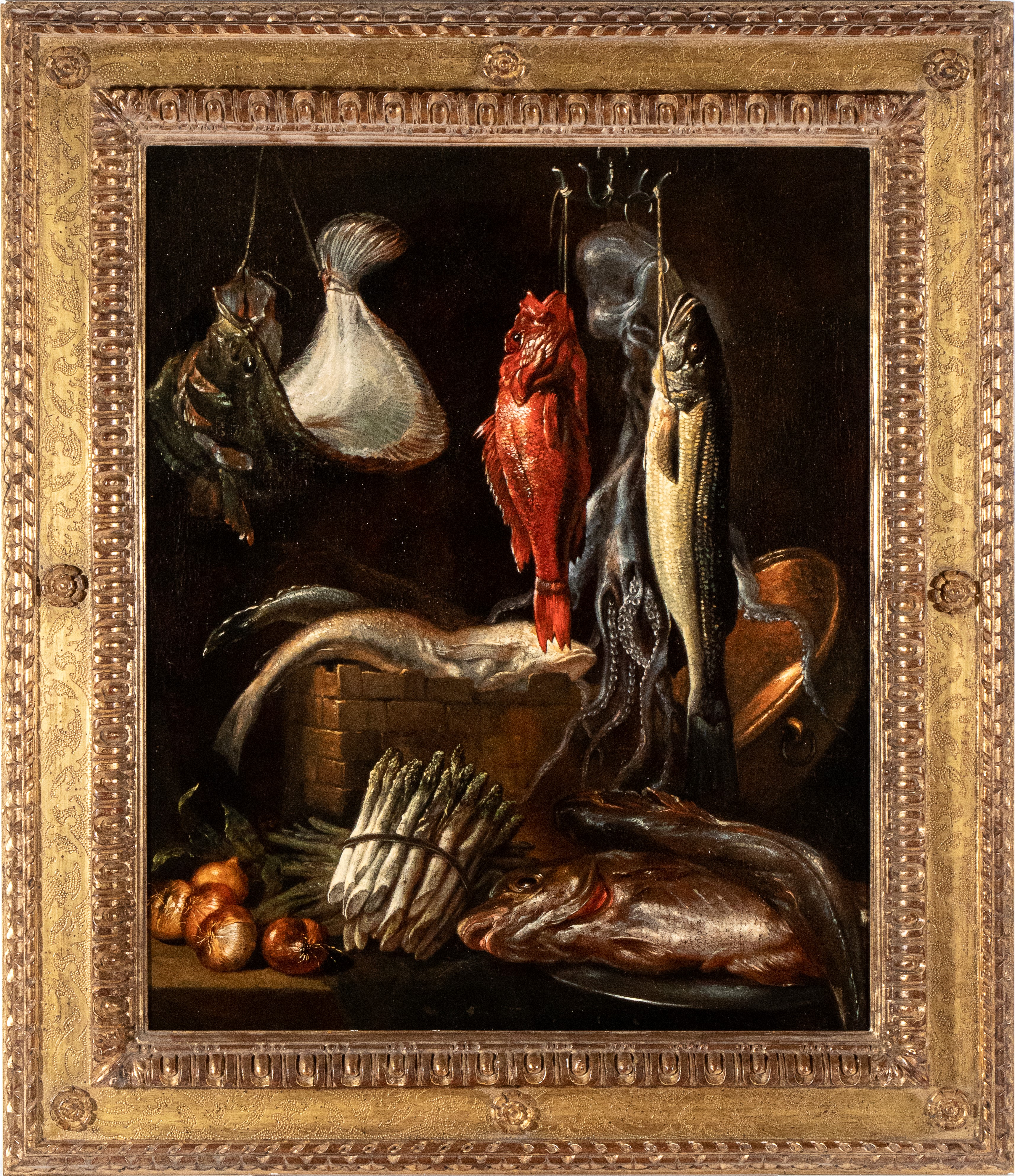 Questa smagliante composizione, che combina la sontuosa esposizione di pescato con un gruppetto di cipolle e un mazzetto di asparagi raccolti da un nastro nero, può essere ricondotta a Giovan Battista Recco, il più misterioso, e forse il più grande, dei membri della celebre famiglia di eminenti specialisti napoletani di natura morta. Di fatto dobbiamo a qualche firma o sigla presente in alcuni suoi dipinti la possibilità di definirne con una certa precisione le peculiarità stilistiche, e a rare citazioni delle fonti e sparute datazioni delle tele le minime notizie biografiche che lo riguardano. Per il nostro dipinto è possibile trovare riscontri piuttosto stretti con varie opere certe del pittore: ritroviamo, infatti, il motivo dei pesci adagiati sul vassoio d'argento nei Pesci e vassoio di ostriche del Nationalmuseum di Stoccolma, mentre per i pesci appesi ai ganci vale il confronto con quelli della Natura morta con pesci, razza e anguille, già nella Galerie Canesso di Parigi, della Natura morta con pesci, aragosta e calamari, firmata e datata 1653, e dell'Interno di cucina della Galleria Regionale di Sicilia di Palazzo Abatellis; chiare analogie di motivi formali, composizione e stile legano infine la tela qui in oggetto alla Natura morta di pesci con bacile di rame della collezione UNICREDIT, la cui paternità resta peraltro ancora discussa tra Giovanni Battista e suo nipote Giuseppe Recco.