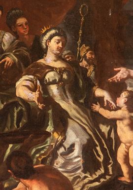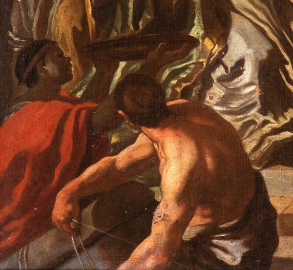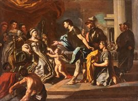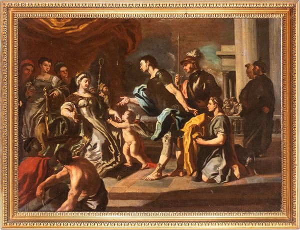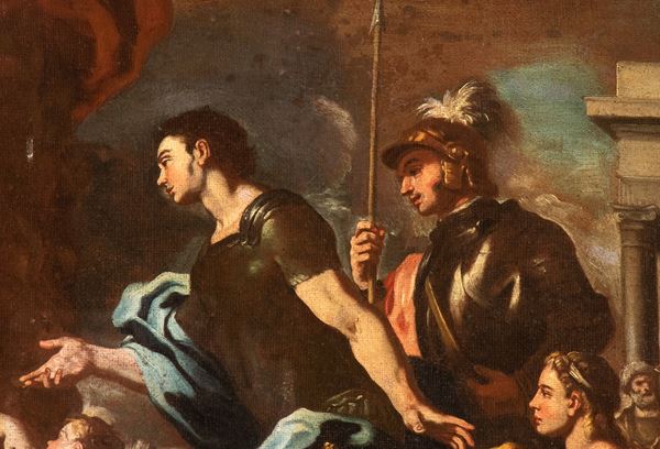 The present work is a fine coeval replica of the painting of the same subject by Francesco Solimena today preserved at the National Gallery in London, which Nicola Spinosa dates to 1708-1710. In his recent monograph on the painter, the scholar notes that "della tela della National Gallery di Londra sono note almeno tre copie d'atelier di ridotte dimensioni e con alcune varianti [la prima delle quali] identificata nel 2000 in una privata raccolta italiana (cm. 75x101) (...)" (Spinosa 2018, p. 393). Although not reproduced, it can be assumed that this studio copy is to be identified with the present example, given the absolute equivalence of the measurements, the presence of some small differences compared to the superb London autograph and the faithful adherence to the master's style.