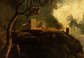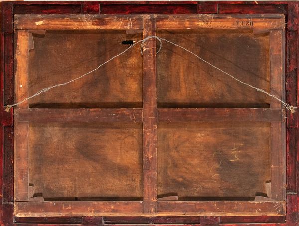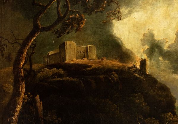 This romantic and stormy landscape scene is of particular interest: it appears to be closely related to an engraving by William Woolett & John Brown published in 1766 and derived, as the caption indicates, from a painting by the great Welsh landscape artist Richard Wilson, which is still considered lost. The painting was exhibited by Wilson at the Society of Artists in 1765 and, like the engraving made from it the following year, depicted the tragic story of Celadon and Amelia, narrated by James Thomson in his four-part poem Seasons, published in 1730. In the engraving, the scene focuses on Celadon's despair as he stands before the lifeless body of his beloved Amelia, killed by lightning. In our painting, it seems that the literary inspiration has been eliminated to make way for the grandiose landscape, reminiscent of Dughet, Claude and Salvator Rosa.