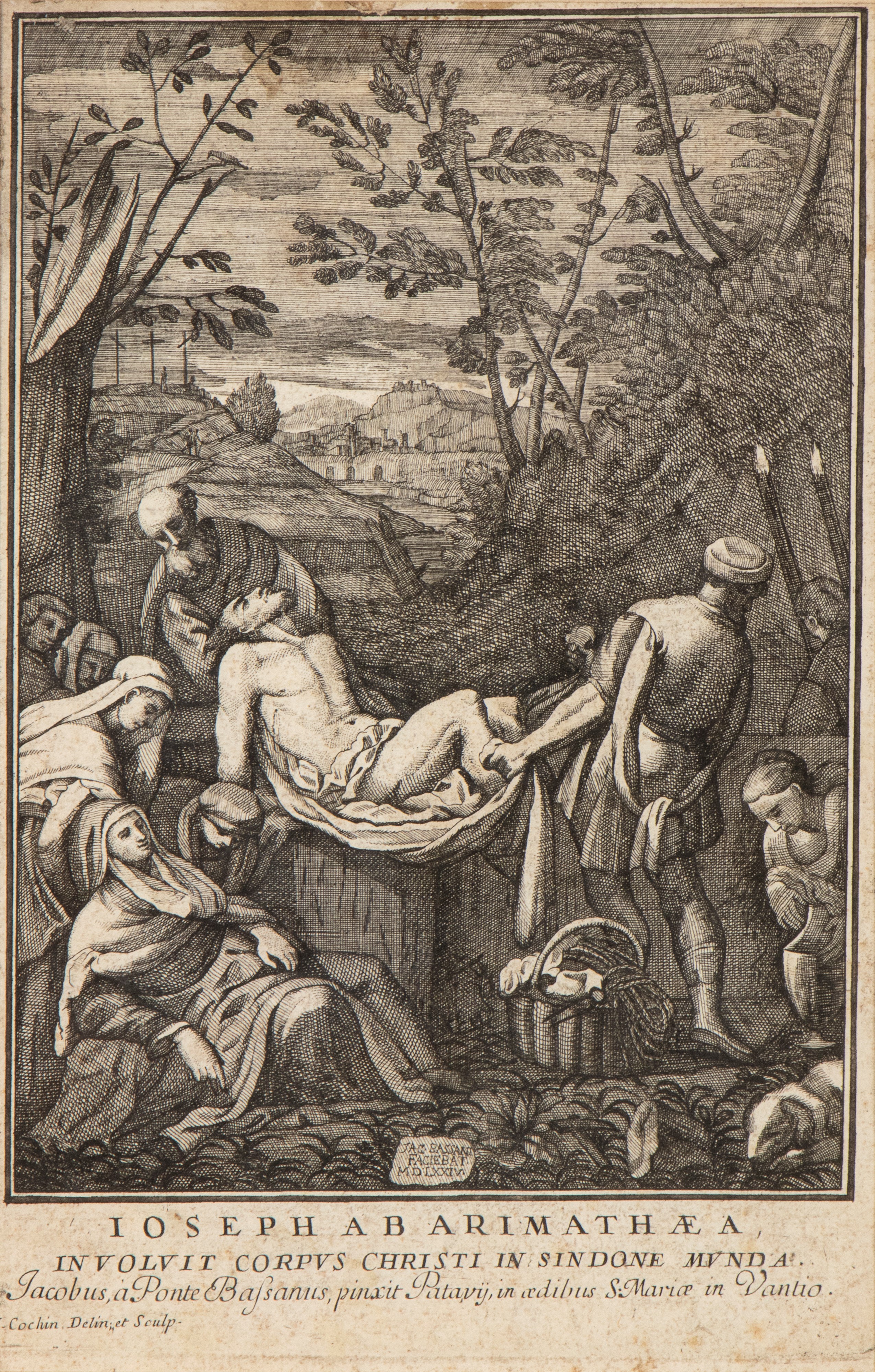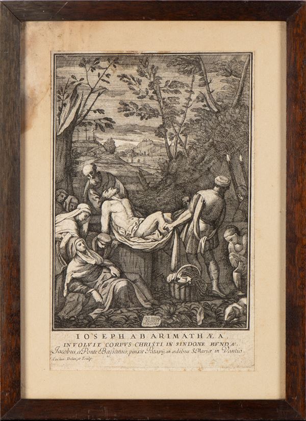 A fine impression on laid paper. The sheet has small tears at the top, scattered stains, and foxing. The print has not been examined outside the frame (41 x 30 x 1 cm).