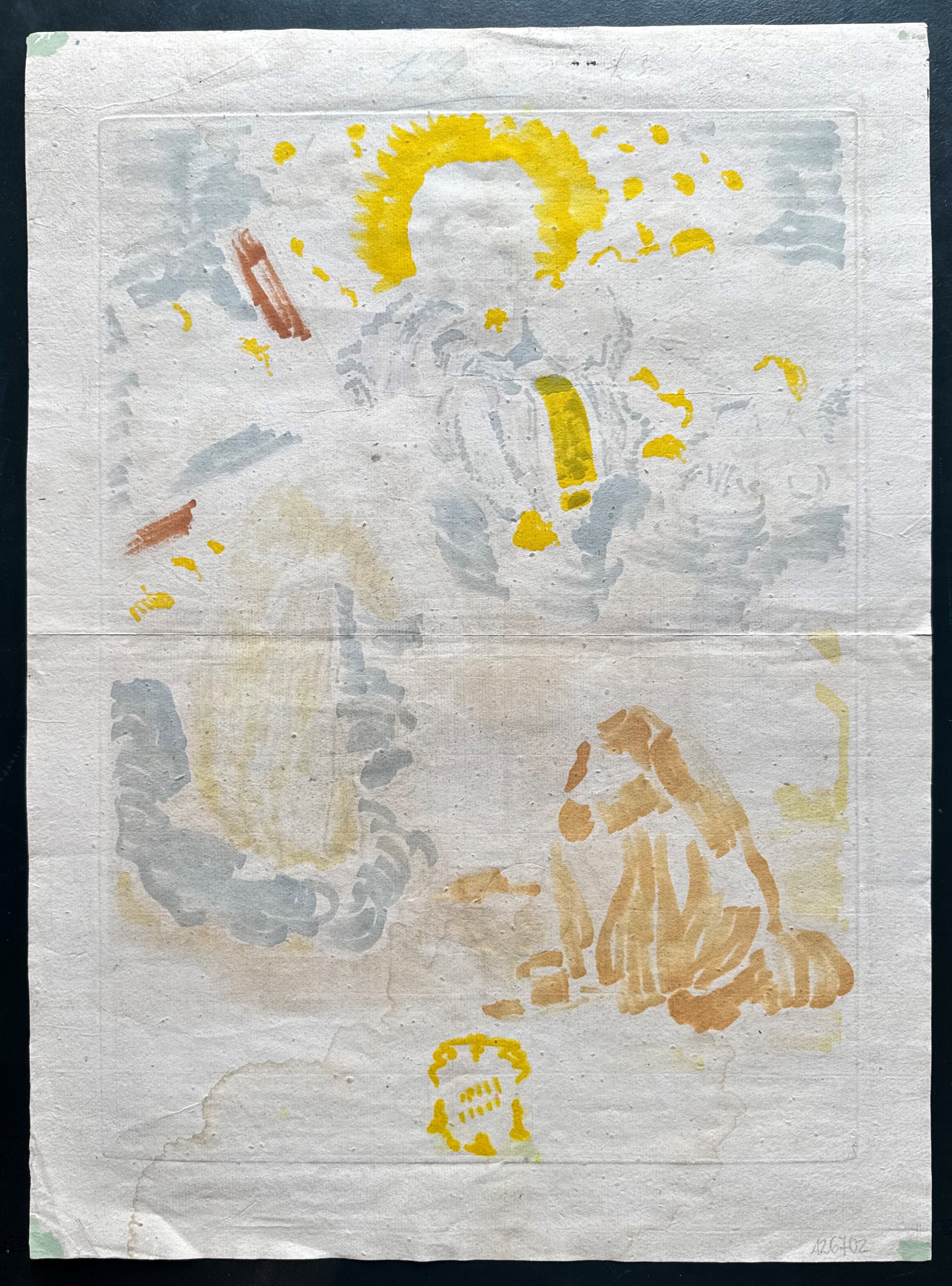 A very fine plate-tone impression, printed on laid paper. Hand-colored copy. Traces of a horizontal fold. A light stain at the bottom and one at the top, but overall in good condition.