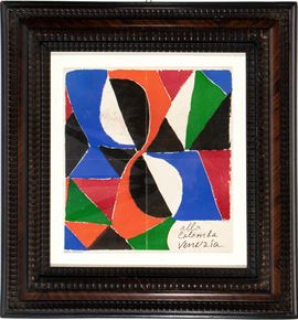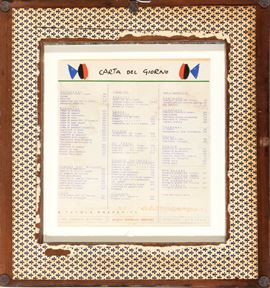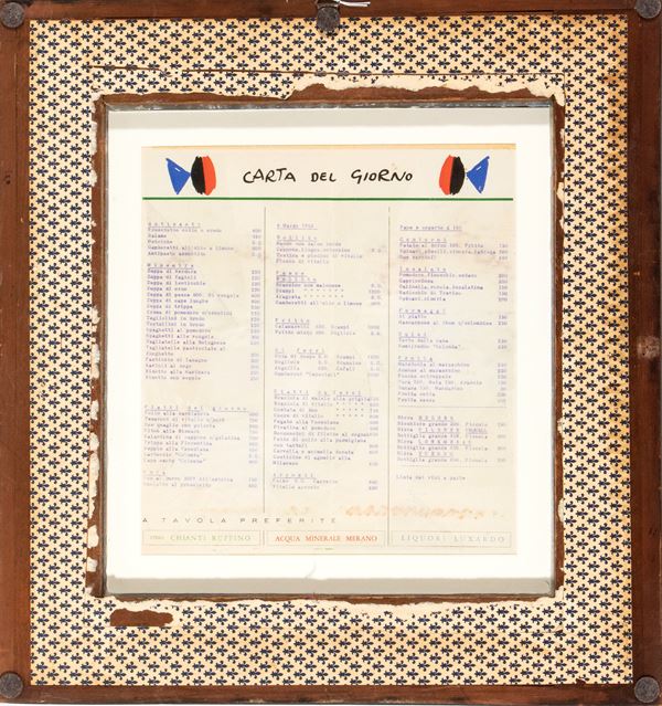Extremely rare example of the menu designed by Sonia Delaunay for the Alla Colomba restaurant in Venice โ card of the day, March 6, 1968. Printed in bright colors. Text on the back. In excellent condition except for traces of one vertical and one horizontal fold. The print has not been removed from the frame (60 x 55 x 6 cm).