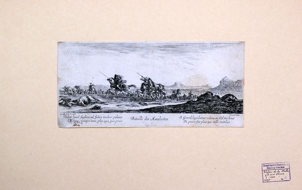 A beautiful engraving on laid paper with watermark (coat of arms). Trimmed but with small margins. Trace of a central vertical fold, some light creasing at the top, and a few stains. A small restoration in the lower left corner. Overall, however, the sheet is in good condition. Collector's stamps of Georg Denzel (1873-1959) (not in Lugt) on the verso and on the backing board.