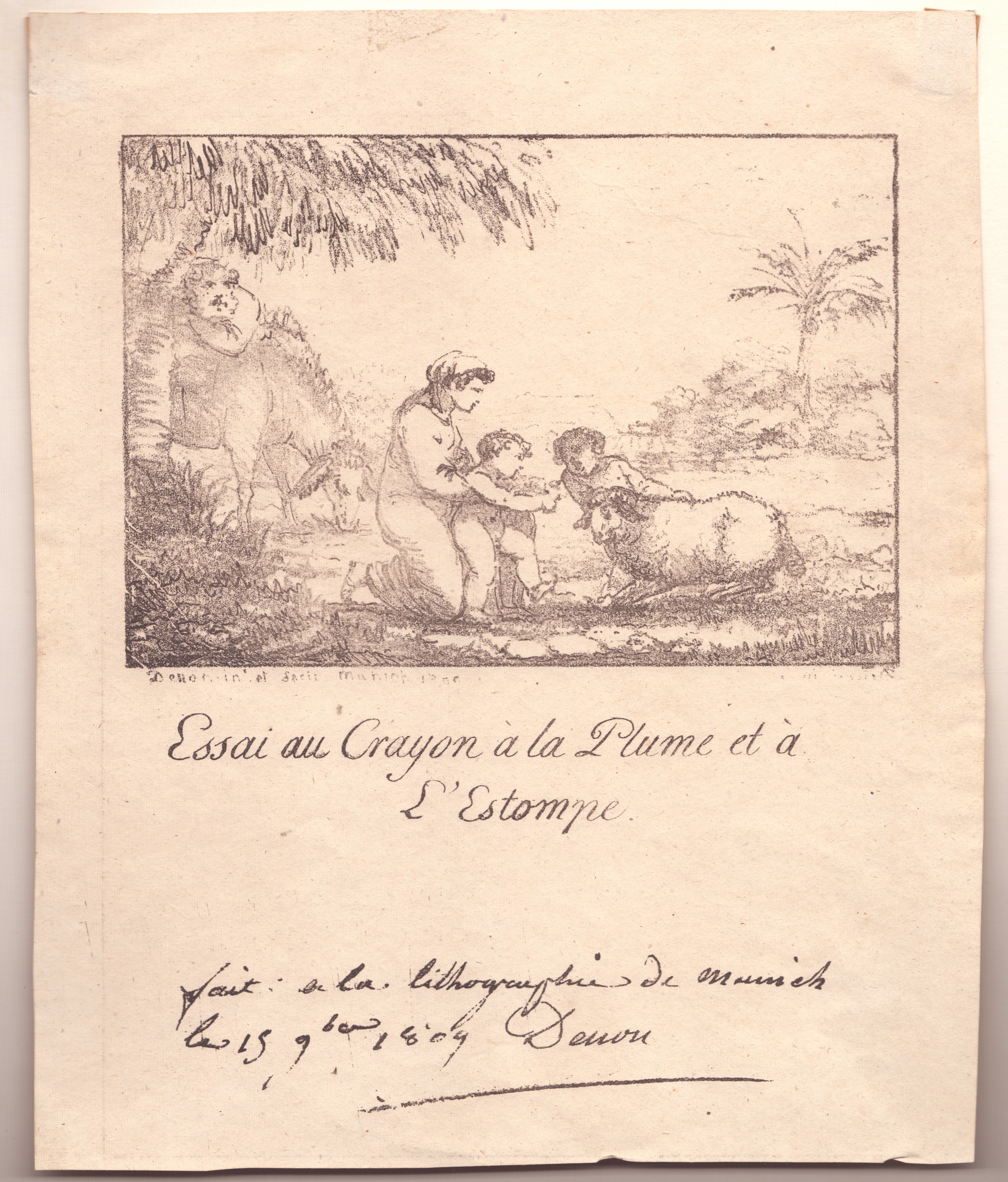 A fine example of an early experiment with lithography. Printed in brownish ink on ivory-colored unlaid paper. In excellent condition.