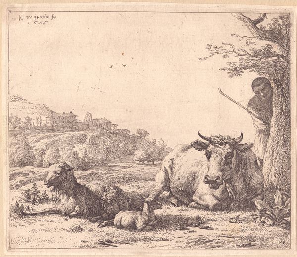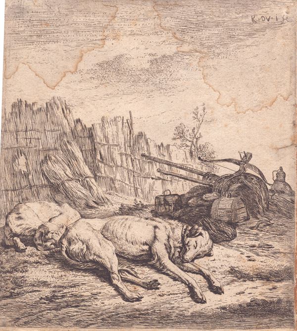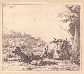 Landscape with a flock and a shepherd behind a tree | Sleeping hunting dogs