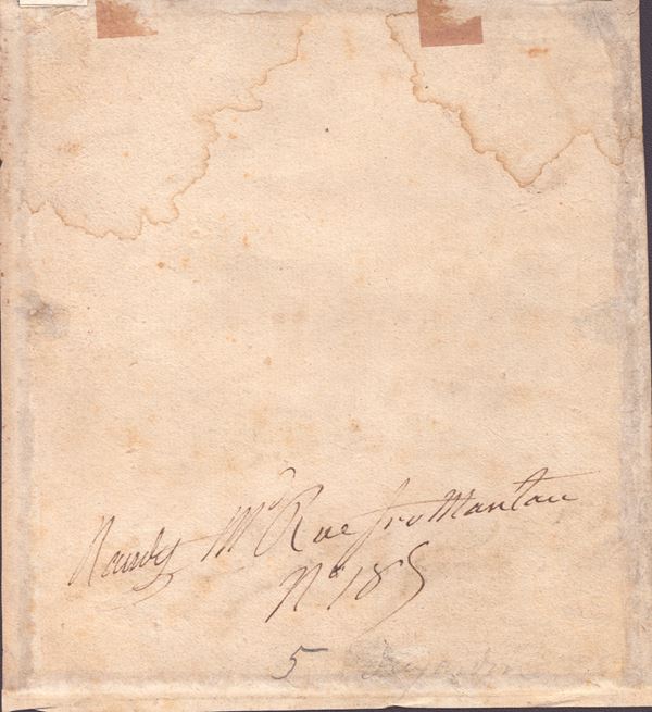 A fine impression on a portion of laid paper without a watermark. This copy has small margins beyond the plate margin. Some browning, a loose stroke at the top of the sheet, thinning of the paper, and tape residue on the verso. Overall, however, in good condition.