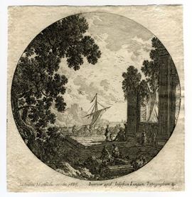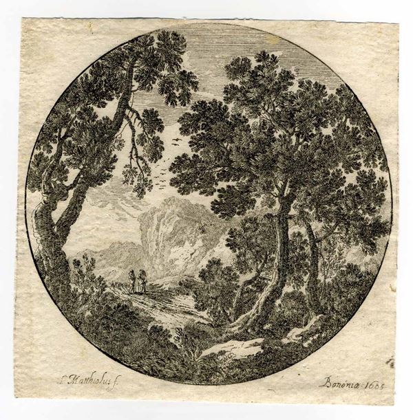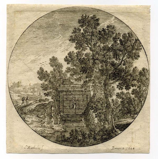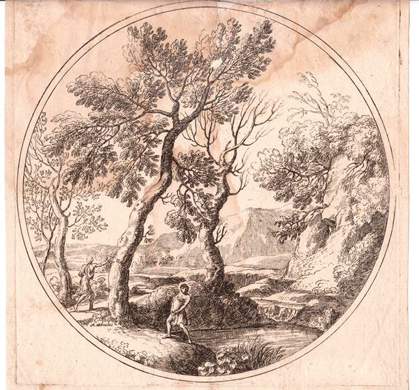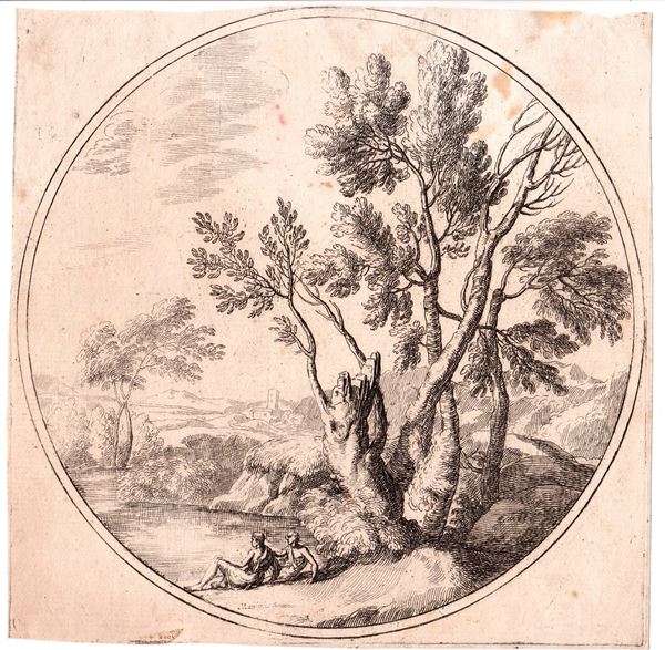 Lot of five etchings from the Passati Tondi series. Etching, approx. 175 x 170 mm (three sheets), 210 x 213 mm (landscape with two seated figures), 225 x 222 mm (landscape with two standing figures). Not in Bartsch's collection.