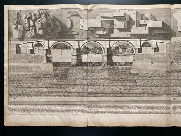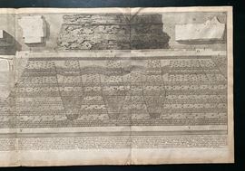 Printed from two plates on two sheets of heavy laid paper joined together. The margins are preserved. Even browning and light foxing, some stains and defects on the edges. Creases along the left edge. Three vertical creases. Overall in good condition. Rare.
