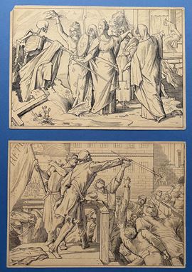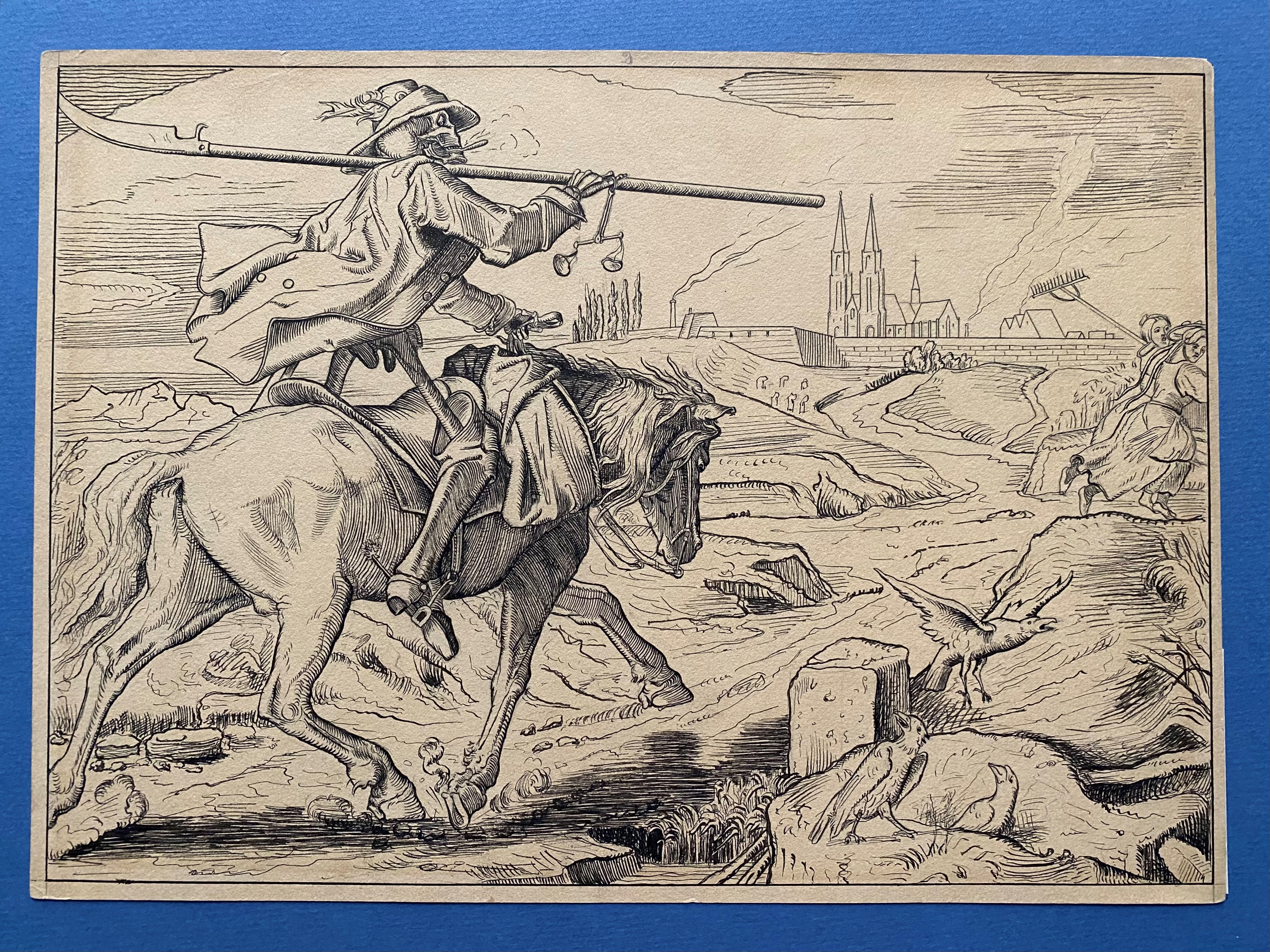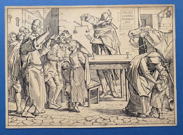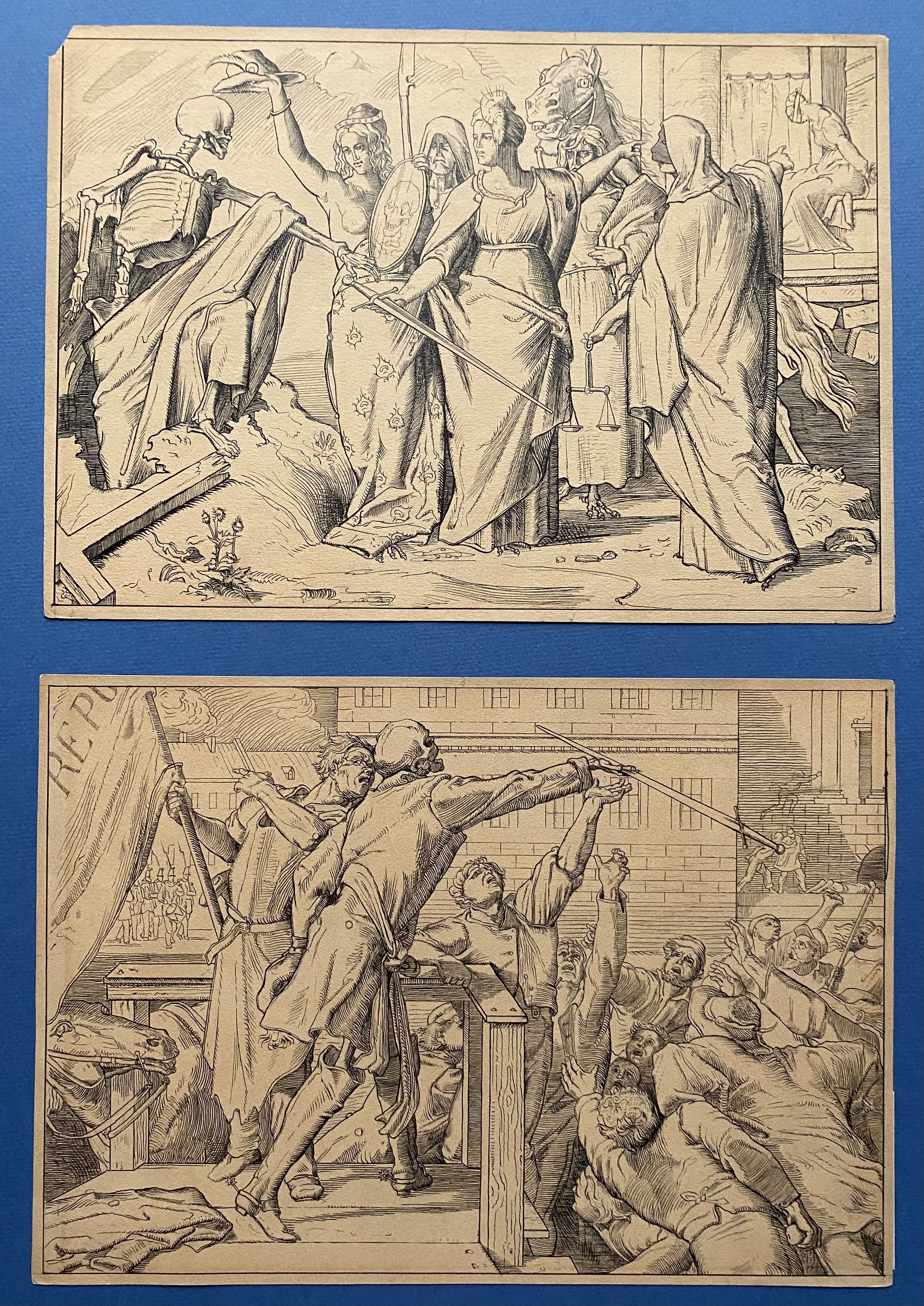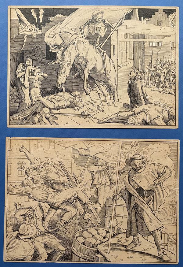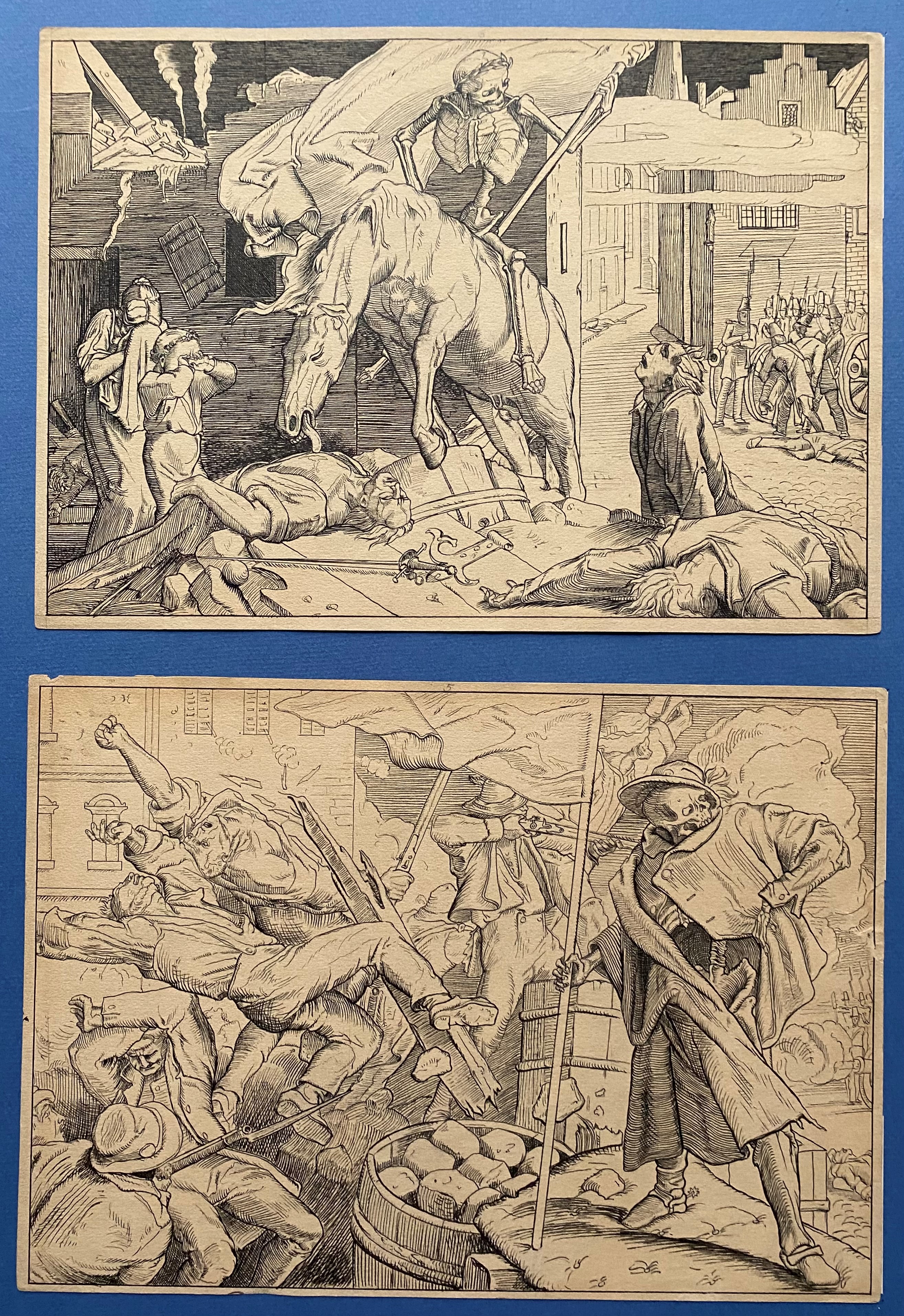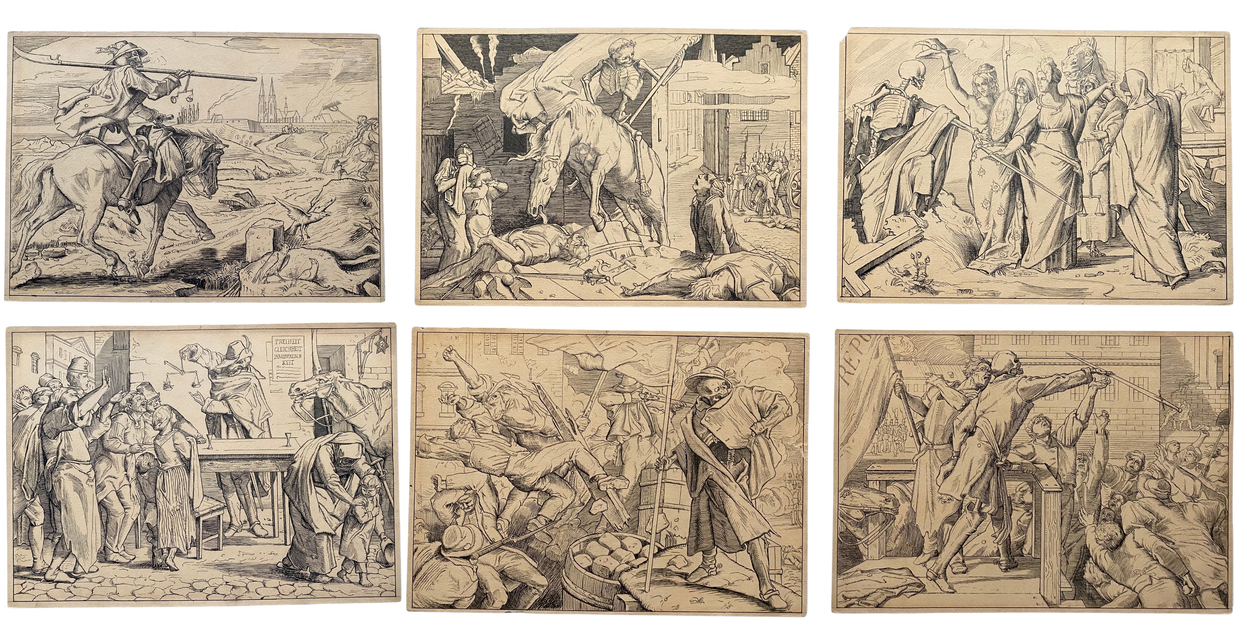 Complete series of six engravings from drawings by Alfred Rethel, depicting a Dance of Death in the context of the 1848 revolutions in Germany. Woodcut, approx. 235 x 325 mm (each sheet).