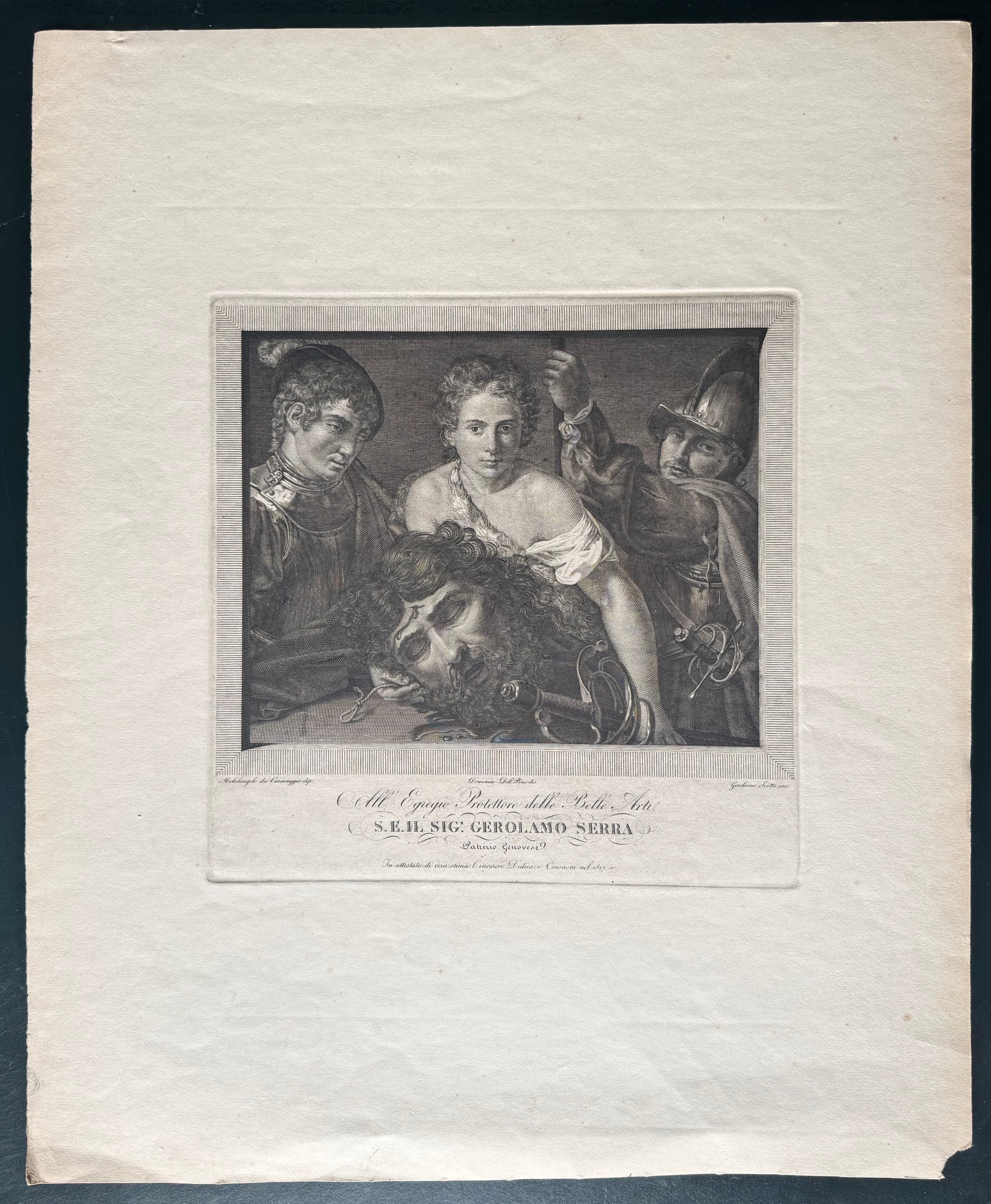 Da quadro erroneamente attribuito a Caravaggio in didascalia. Bulino, 610 x 497 mm (foglio).