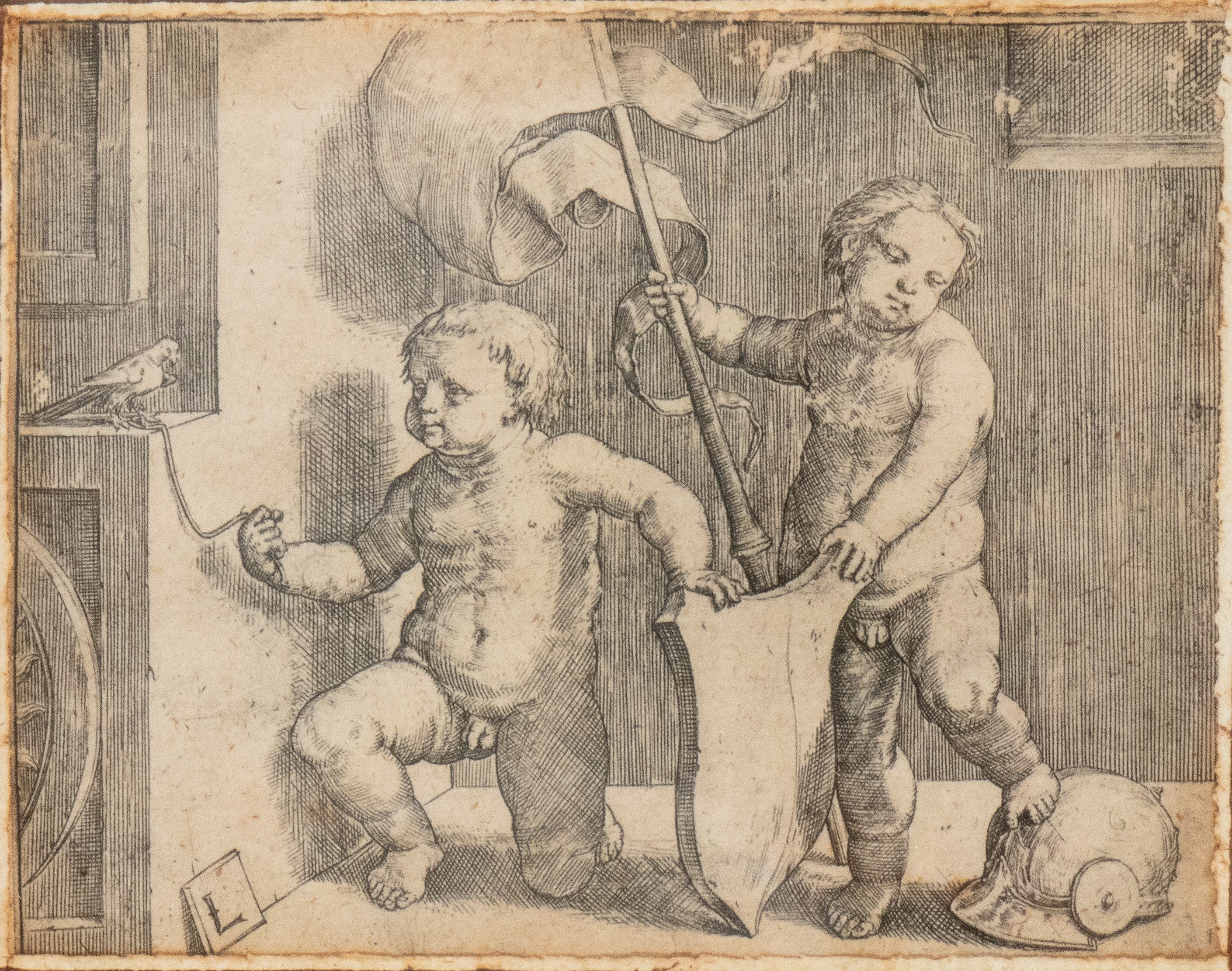Two cherubs holding a shield