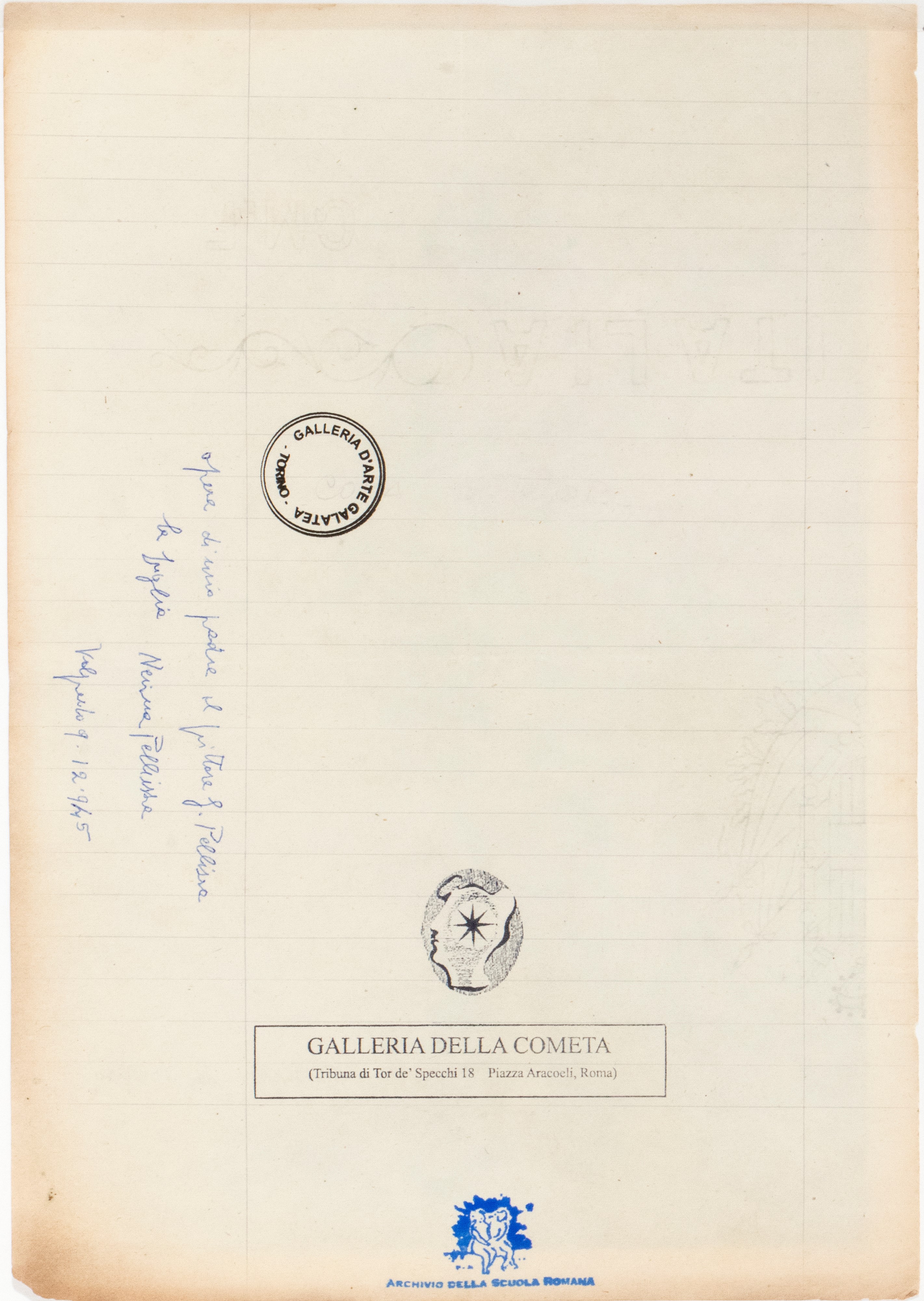 On the back there is a signature and a declaration of authenticity of artist's daughter Nerina Pellizza and various stamps: Galleria della Cometa in Rome, Galleria d'Arte Galatea in Tutin, Archivio della Scuola Romana