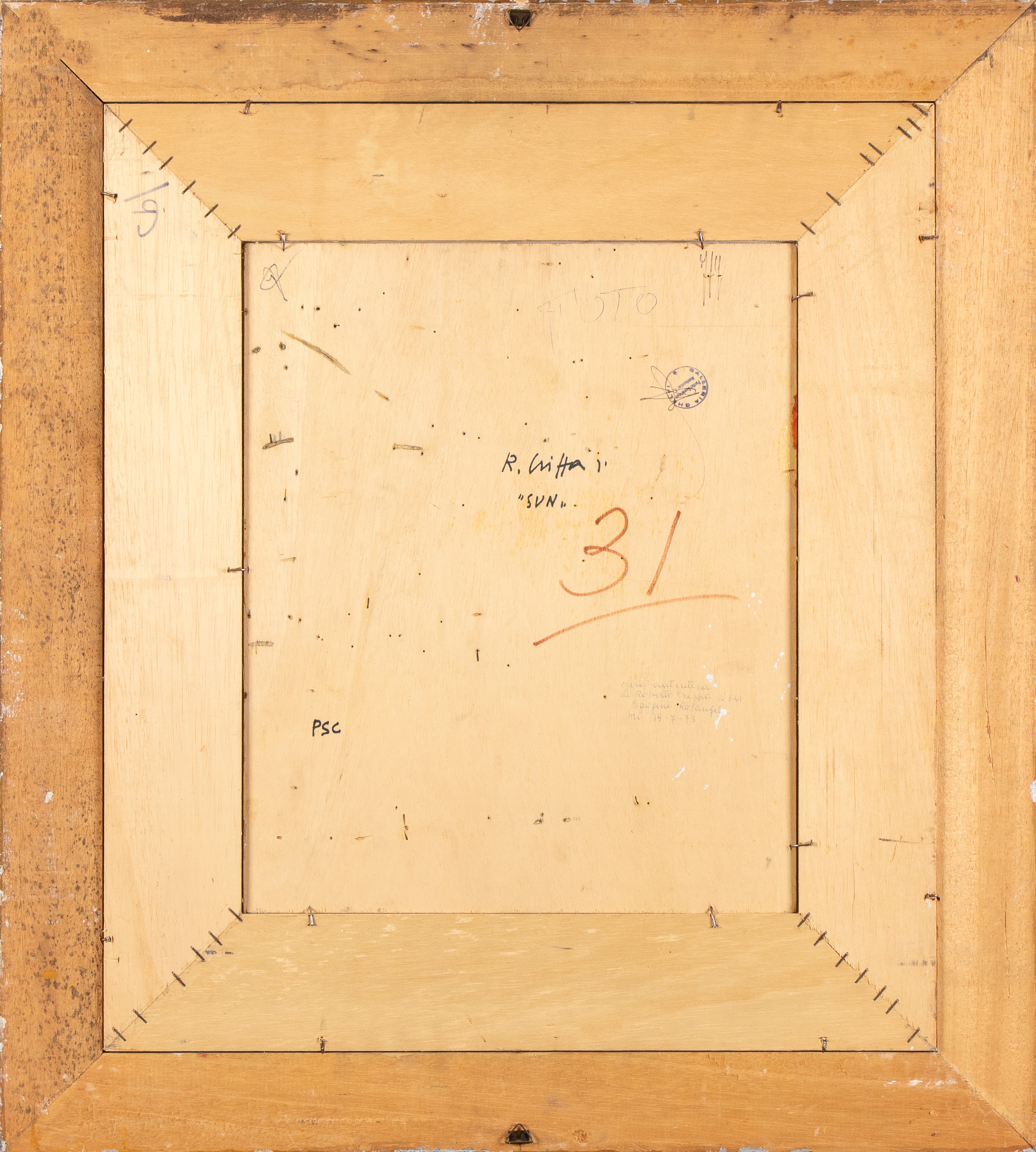 Signed and titled on the back: R. Crippa, Sun, statement of authenticity by his wife Rosangela Baggini: "opera autentica di Roberto Crippa n. 641, Rosangela Baggini, 19/07/93". Stamp of the Galleria Ghelfi on the back.